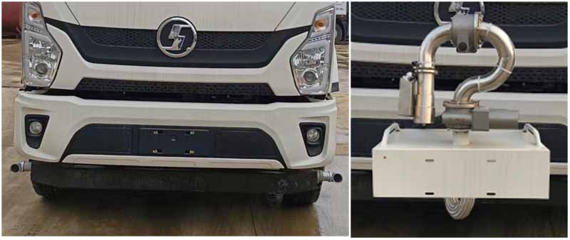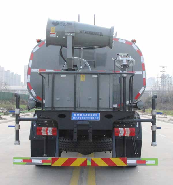备注 | 该车用途为城乡道路和铁路矿场的抑尘降霾,主要装置为罐体及喷雾装置.罐体总容量:13.4立方米,罐体有效容积:12.76立方米;罐体外形尺寸(长×长轴×短轴)(mm):4800×2450×1600.ABS系统生产厂家及型号分别为:西安正昌电子股份有限公司,型号ZQFB-V.侧、后防护材料均为:Q235碳钢,连接方式均为:螺栓连接,后部防护截面尺寸(mm):120×50,后部防护离地高度(mm):470.仅采用底盘4500mm轴距改装.选装前部不带电子雾炮,选装前部电子雾炮样式.当前部不带电子雾炮时,车辆长度8650mm,无前伸;当前部选装电子雾炮时,车辆长度9150mm,前伸500mm. |