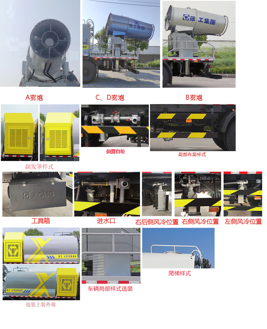 装备ABS,型号/生产厂家:3631010-C2000/东科克诺尔商用车制动系统(十堰)有限公司.选装限速装置,限速79km/h.随底盘选装驾驶室,驾驶室遮阳板,该车专用装置为喷雾系统装置、储液箱,主要用于道路、广场或固定场所除霾降尘等作业;其他说明:罐体有效容积11.18立方米,罐体尺寸(长度×长轴×短轴)(mm):4450×2440×1750;仅选用4350+1350mm轴距.1、选装A雾炮时:车辆的后伸(mm)/长度(mm)/高度(mm)/整备质量(kg):625/10925/3730/13650;2、选装B雾炮时,车辆的后伸(mm)/长度(mm)/高度(mm)/整备质量(kg):681/10981/3620/13450;3、选装C、D雾炮时,车辆的后伸(mm)/长度(mm)/高度(mm):1047/11347/3844,C雾炮整备质量为13756mm,D雾炮整备质量为14190mm;选装副发罩样式、侧置自吸、局部布局样式、工具箱、风冷位置、上装外观、车辆局部样式、爬梯样式,此系列选装引起的参数变化忽略不计;侧面防护装置材质为Q235B,连接方式为螺栓连接;后防护装置材质为Q235B,连接方式为螺栓连接;后部防护装置的断面尺寸为180×60mm,离地高度为470mm. |