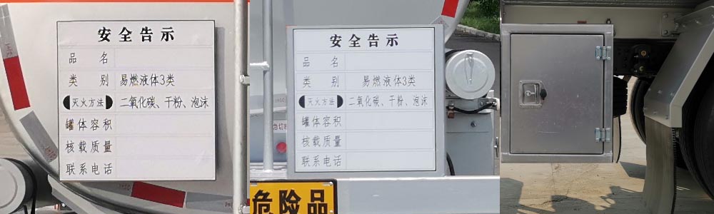 备注 | 1.该车为危险品车辆,危险货物运输车辆的类型为FL型,罐体总容量8.3立方米,罐体有效容积:8.06立方米;准运介质的最大密度830千克/立方米,罐体尺寸(长×长轴×短轴)(mm)为:4800×1800×1230.2.侧防护和后防护装置采用Q235B,连接方式为螺栓连接,后防护装置断面尺寸为(mm):120×64,离地高度:450mm;仅采用轴距(mm)为3800.3.加油机型号及生产企业:HT-YV60E,HT-CZ1111,ZH3111P/湖北华特专用设备有限公司,BL1111Z/珠海市贝林加油设备有限公司中山分公司,HS1812B/托肯恒山科技(广州)有限公司,SKES-1112/恒和嘉华科技有限公司(上海伯莱机械有限公司),SK20QF111A,SK30ZF111A,SK30ZF222A,SK52GF222K(ZT),SK20QF-111A,SK20QF-222A/郑州三金石油设备制造有限公司,CS20D1110F/正星科技有限公司,JSK-70B1121CZ,JSK-70B1121C,JSK45B1121C/稳恩佳力佳(北京)石油化工设备有限公司,ZH3111,ZH6444/佛山市众泽机电科技有限公司,XTST121BF1/邢台正润通科技发展有限公司,TA-1111KFJ/沈阳航天新阳机电有限公司,FB80(EX),AC-FB80,ACZS-1112,ACZS-1111/永嘉县奥诚五金制品有限公司,FX-FB90,ZSCS-1112,ZSZS-C2444/永嘉县智胜机械设备有限公司,HM-8111/日照惠明机械设备有限公司,ZY181111/安徽省中原仪表有限公司.4.ABS型号/厂家:ABS型号:ABS/ASR-24V-4S/4M,厂家:襄阳东风隆诚机械有限责任公司;安装有限速装置,限速装置限速(km/h):80,转向轮安装爆胎应急防护装置,排气管前置,前轮装有盘式制动器,安装具有卫星定位功能的行驶记录仪,安装直接供电式ETC车载装置,仅采用底盘子午线轮胎;选装安全告示牌大小及位置,选装右后带工具箱状态.随底盘选装驾驶室. |