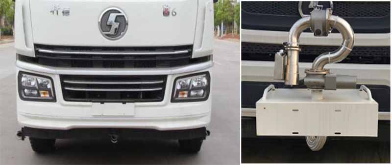 该车用途为城乡道路和铁路矿场的抑尘降霾,主要装置为罐体及喷雾装置.罐体总容量:17.8立方米,罐体有效容积:16.96立方米;罐体外形尺寸(长×长轴×短轴)(mm):6700×2450×1580.ABS系统生产厂家:西安正昌电子股份有限公司,型号:ZQFB-V.侧、后防护材料均为:Q235碳钢,连接方式均为:螺栓连接,后部防护截面尺寸(mm):120×50,后部防护离地高度(mm):490.仅采用底盘4375+1350轴距(mm)改装.选装前部不带电子雾炮,选装前部电子雾炮样式.当前部不带电子雾炮时,车辆长度10500mm,无前伸;当前部选装电子雾炮时,车辆长度11000mm,前伸500mm. |
