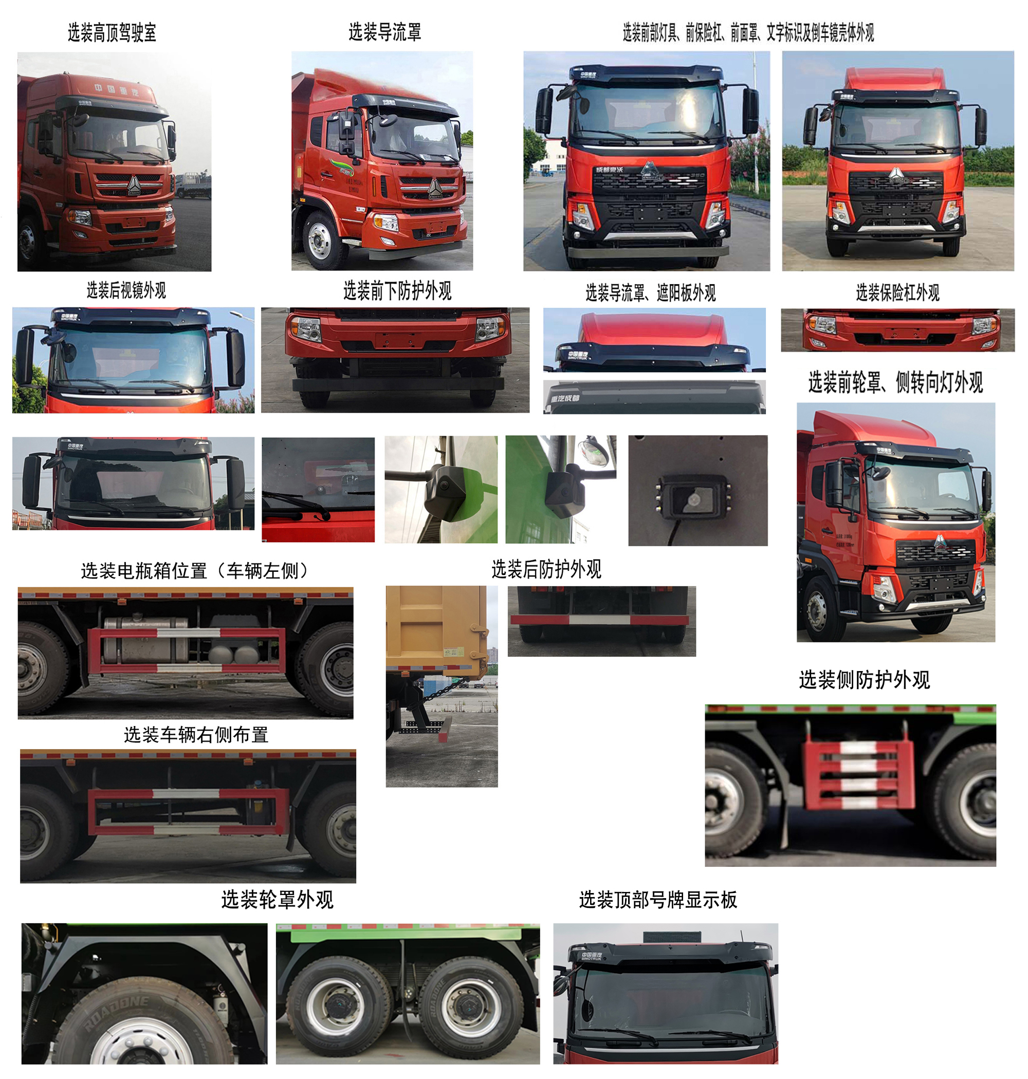 ①自卸方式为后卸;②选装高顶驾驶室,选装导流罩,选装前部灯具、前保险杠、前面罩、文字标识及倒车镜壳体外观,选装遮阳板外观,选装保险杠外观,选装前轮罩、侧转向灯外观,选装后视镜外观,选装前下防护外观,选装侧防护外观,选装后防护外观,选装电瓶箱布置型式,选装轮罩外观,选装顶部号牌显示板;选装货箱外观,带环保布;③发动机的油耗申报值(L/100km)为WP8.350E62(40.3);④ABS型号为:ABS-E 4S/4M,生产厂家为:采埃孚(上海)管理有限公司;选装EBS,EBS型号为:CM-EBS,生产厂家为:广州瑞立科密汽车电子股份有限公司;⑤侧面防护装置所用材料材质为Q235,连接方式为螺栓连接;后部防护装置所用材料材质为Q235,连接方式为螺栓连接,断面尺寸为120mm×50mm、120×100mm,离地高度为470mm。⑥该车型可选装ETC车载装置。安装带卫星定位功能的行驶记录仪。 |