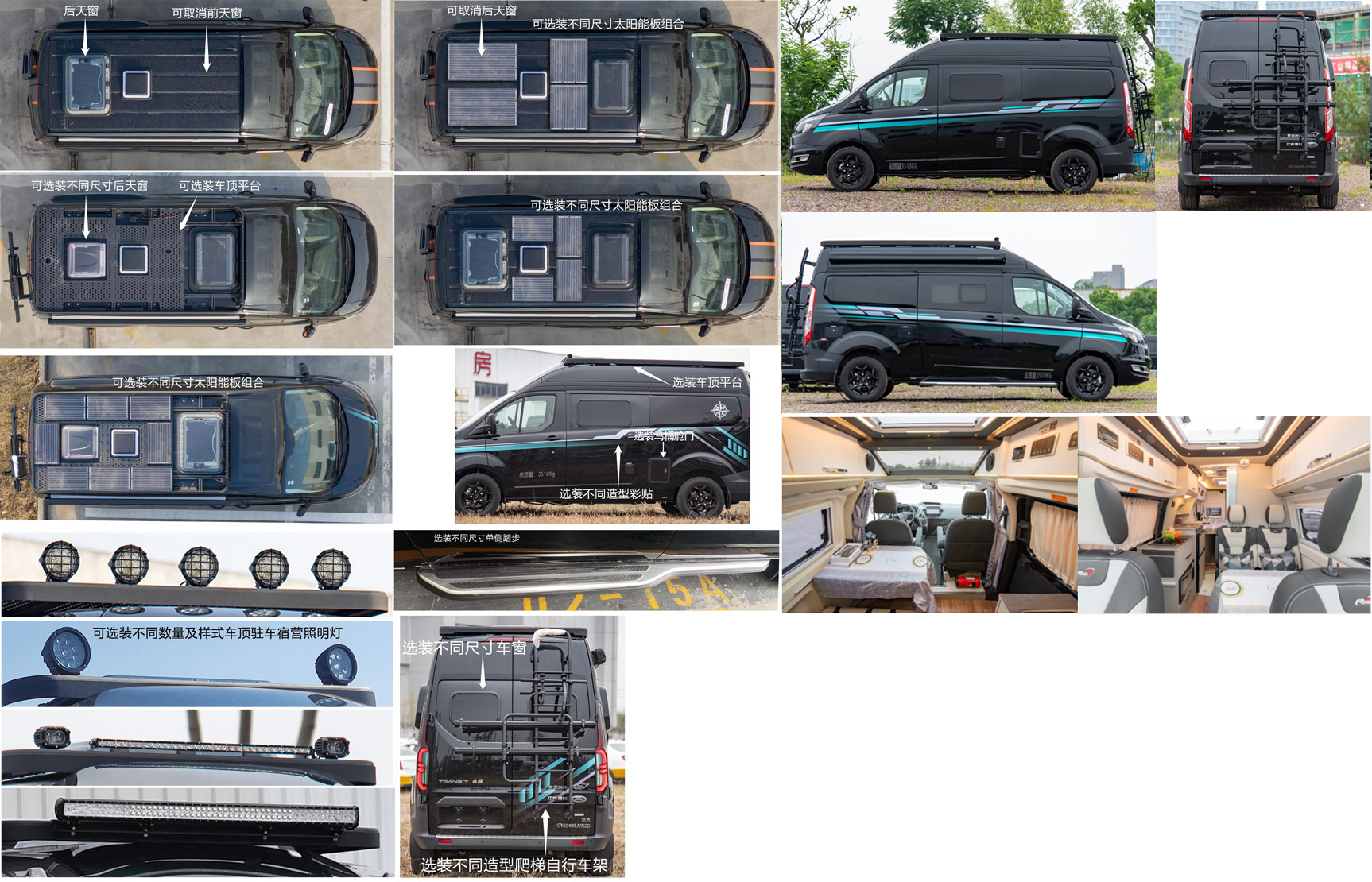 该车配备卧具、厨具、卫生、娱乐等旅居生活、娱乐设施,用于旅行宿营,旅居车桌椅可转换为卧具.1:随底盘选装不同轮辋,前格栅,前后保,车身不同色后视镜;2:选装后天窗,车顶平台,太阳能板组合,尾部爬梯,自行车架,选装不同样式车顶驻车宿营照明灯,选装不同彩贴,不同尺寸单侧踏步,选装左侧马桶舱门位置,可取消前天窗;3:选装不同内饰;4:座位数4、5座时车辆整备质量2720kg,6座时车辆整备质量2820kg;5:侧、后防护以车身结构代替,材料为金属.侧防护离地高254mm,后防护离地高403mm.ABS系统控制器型号:ESP9或3550A500,生产厂:博世汽车部件(苏州)有限公司或浙江亚太机电股份有限公司,发动机最大净功率:104kW.宿营照明灯行车状态不可开启,可选装ETC车载装置. |