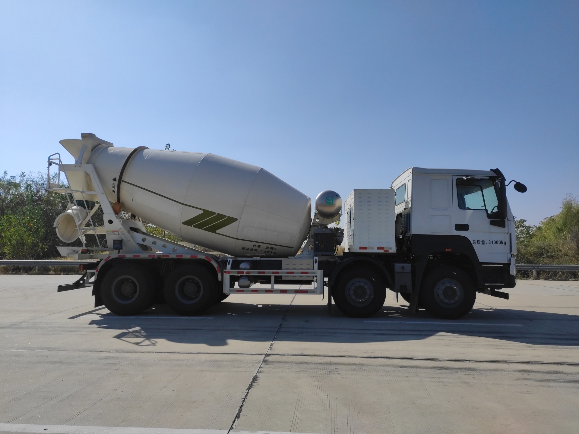 豪沃牌前四后八7.3方纯电动混凝土搅拌运输车外形尺寸为10400×2550×3965mm。上户吨位为15950kg,总质量为31000kg,驾驶室比普通载货车驾驶室要高,视线更加开阔,准乘人数为2人,轴距为1800+3525+1350(mm),罐体多为梨形设计,材料为合金钢锰钢制作,耐磨性强,使用寿命长,加长的卸料槽可以180度旋转,卸料简单方便。