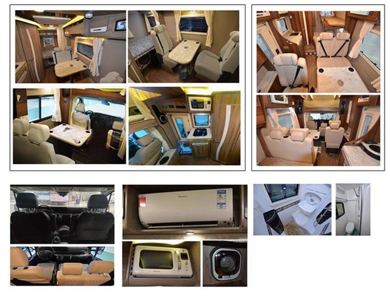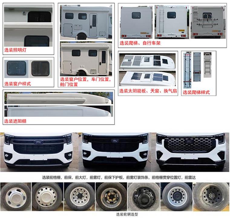 1.专用装置:炊具、卫生间、卧具等生活设施;2.该车侧后防护为裙板结构,后防护离地高度395mm;3.顶部为升降结构,车辆在行驶过程中不得进行顶部升降操作;4.选装内部布局,选装照明灯(行驶过程中不可开启),选装窗户样式,选装窗户位置、车门位置、舱门位置;顶部安装太阳能板时整车高度为2830mm;右侧安装遮阳棚时整车宽度为2400mm,同时安装遮阳棚和遮雨棚时整车宽度为2450mm;顶部可选装天窗、换气扇、换气扇,后部选装爬梯及爬梯样式、自行车架; 5.随底盘选装:前格栅,前保,前大灯,前雾灯,前保下护板,前雾灯装饰条,前格栅贯穿位置灯,前雷达,轮辋造型;直接供电式ETC车载装置;仅选用后围贯通底盘;安装限速装置,限速100km/h; 6.ABS系统控制器型号/生产厂家: 3550B500/浙江亚太机电股份有限公司,ESP9/博世汽车部件(苏州)有限公司;7.发动机/最大净功率: DURATORQ4D236H/126kW. |