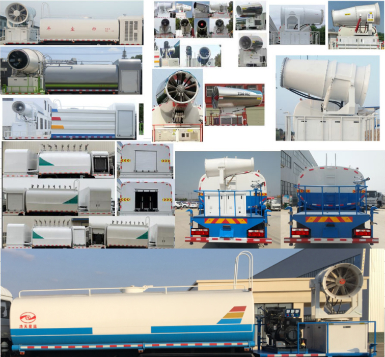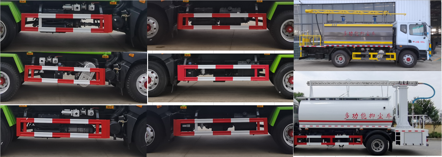 选装后雾炮装置。仅采用4700,4500mm轴距底盘,整车长/轴距对应关系(mm):8860/4700,8660/4500;侧防护材料Q235,螺栓连接;后防护装置材料为Q235B,焊接连接,断面尺寸为:140×50(mm),离地高度为:380mm,选装后防护离地高500mm;ABS系统生产厂家/型号:焦作博瑞克控制技术有限公司/J ABS;该车专用装置主要是喷雾机,用于降低空气中的灰尘,雾霾等现象.选装后平台样式,外观样式,左右出水口及附件位置。选装外观样式。 |