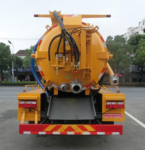虹宇牌东风多利卡国六11.5方清洗吸污车的外观时尚美观,设计科学,外形尺寸为7360×2350,2400×3250,3350(mm),额定上户吨位为5665(kg),总质量为14060(kg),整车上装罐体采用优质钢板一次冲压成型,密封性好,吸污罐体可举升,后盖可以液压打开,排污更彻底,采用进口的高压清洗泵,疏通管道更方便,更彻底,视污窗,洗手装置,高压清洗管,吸污管等配置齐全。