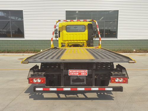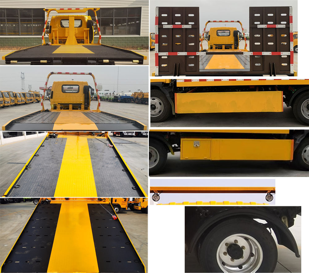 选装车辆后部结构样式;该车不具备拖牵功能,托举质量为0。侧防护装置材料:Q235,连接方式:螺栓连接;选装侧防护平面结构,材质:Q235,连接方式:螺栓连接;后下部防护装置材料:Q235,连接方式:焊接连接,防护截面尺寸(mm)100×50,离地高380mm。ABS系统控制器型号/生产企业:YF8/武汉元丰汽车电控系统有限公司,ABS-E/威伯科汽车控制系统(中国)有限公司,ABS-VI·E/广州瑞立科密汽车电子股份有限公司,YF9/武汉元丰汽车电控系统有限公司。该车主要用于道路车辆清障,主要专用装置为平板,绞盘。整备质量不包含随车工具、备胎。选装上装平板不同材质;选装龙门架照明灯具,该灯具仅在停车作业时使用;选装弧形挡泥板。 |