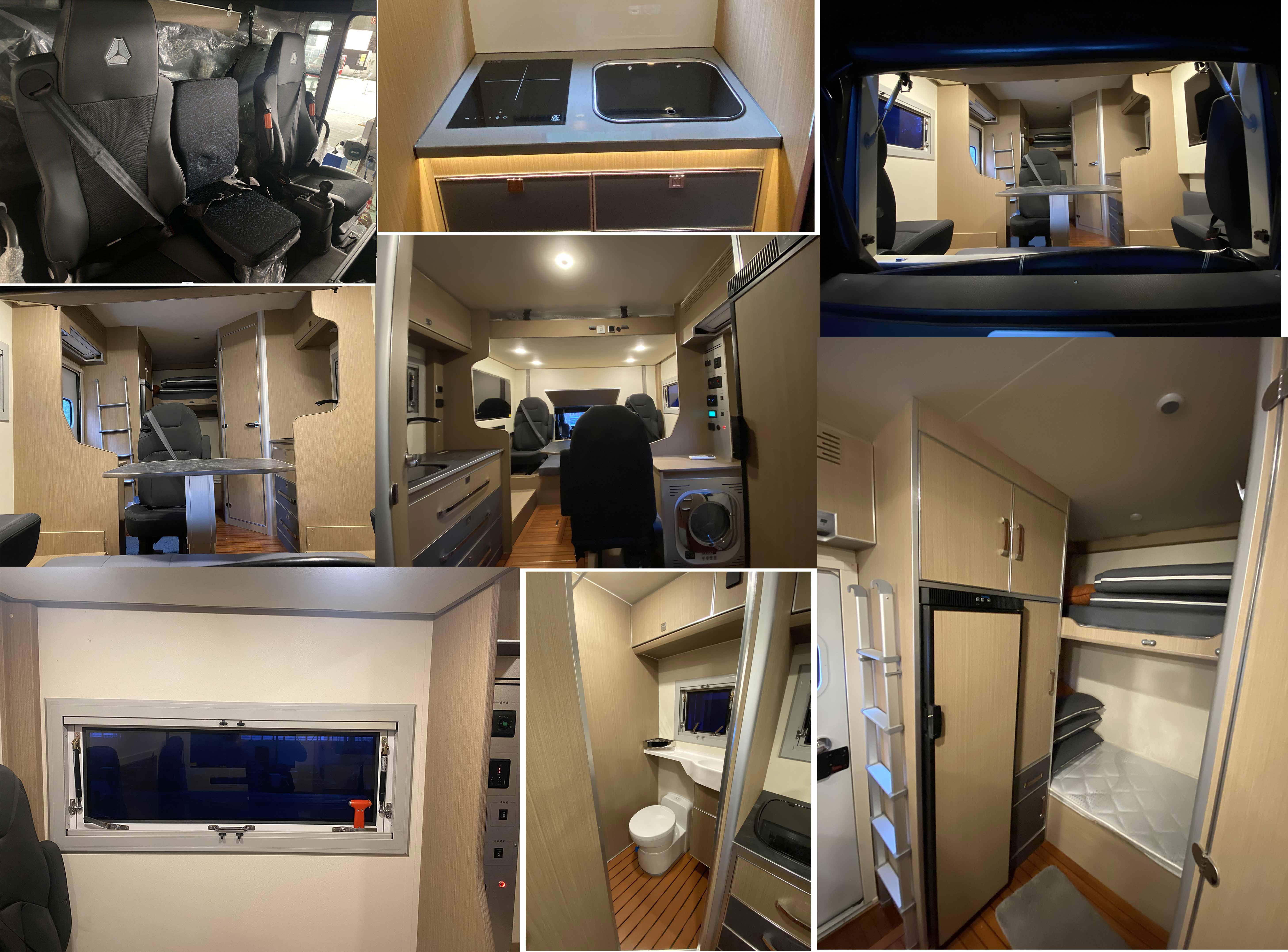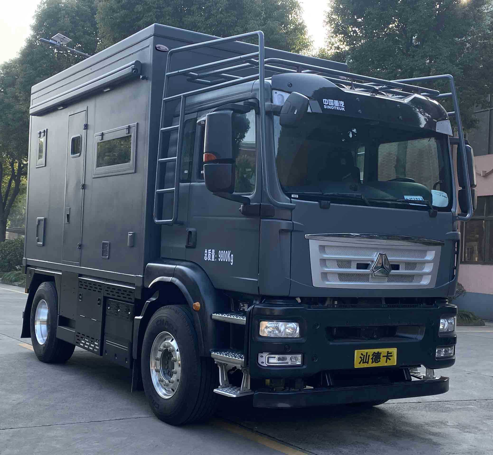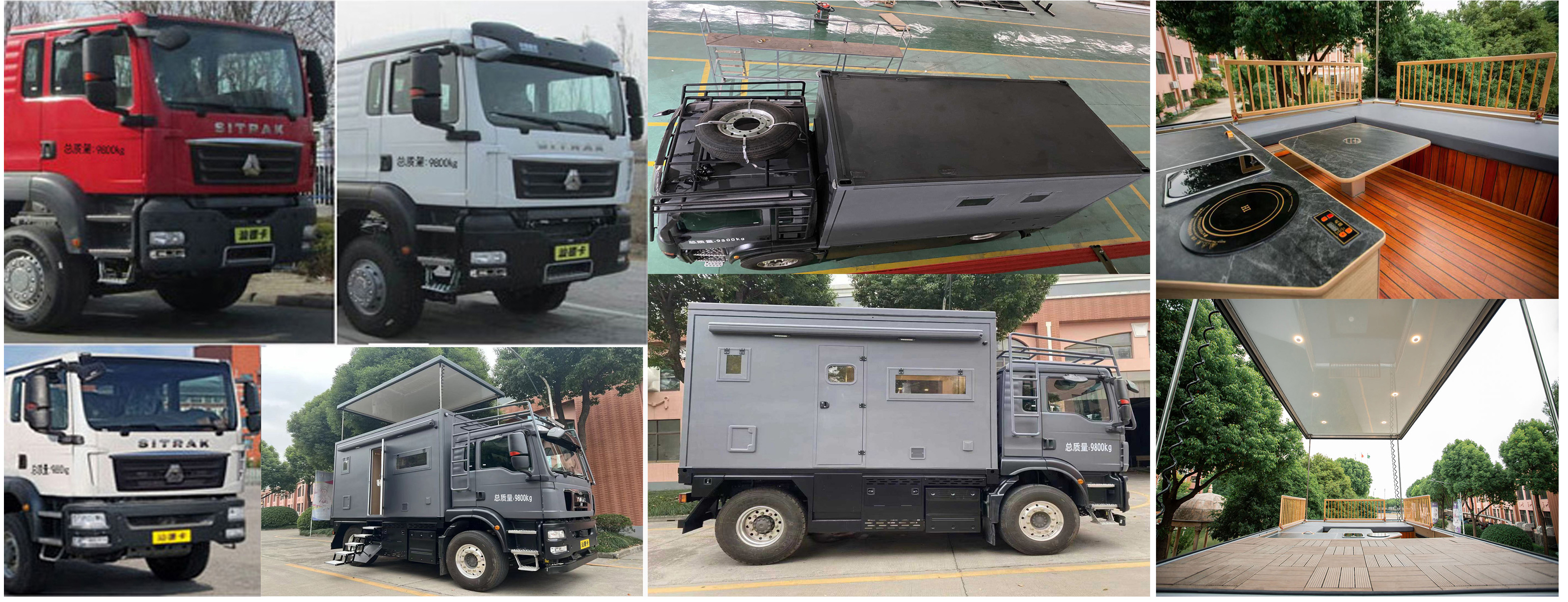 该车设有专用装置:驻车娱乐休闲区,睡具,炊具,储物柜,卫生设施等设施,用于旅游的专用汽车;选装遮阳棚宽度为2550mm,选装不带遮阳棚2500mm;选装不带太阳能板,安装EBS,EBS系统控制器生产企业为采埃孚商用车系统(青岛)有限公司,EBS系统控制器型号为EBS3,侧防护为裙边结构,材质为Q235;后防护材质为Q235,后部防护断面尺寸(mm):100×50,后部防护离地高度(mm):425,连接方式为螺栓连接.选装直接供电ETC车载装置。仅选用3600mm轴距.右侧安装的照明灯,仅在驻车作业状态下使用。随底盘选装驾驶室.后悬架形式:空气悬架。选装厢体顶部拓展机构,拓展机构仅在驻车状态时使用。 |