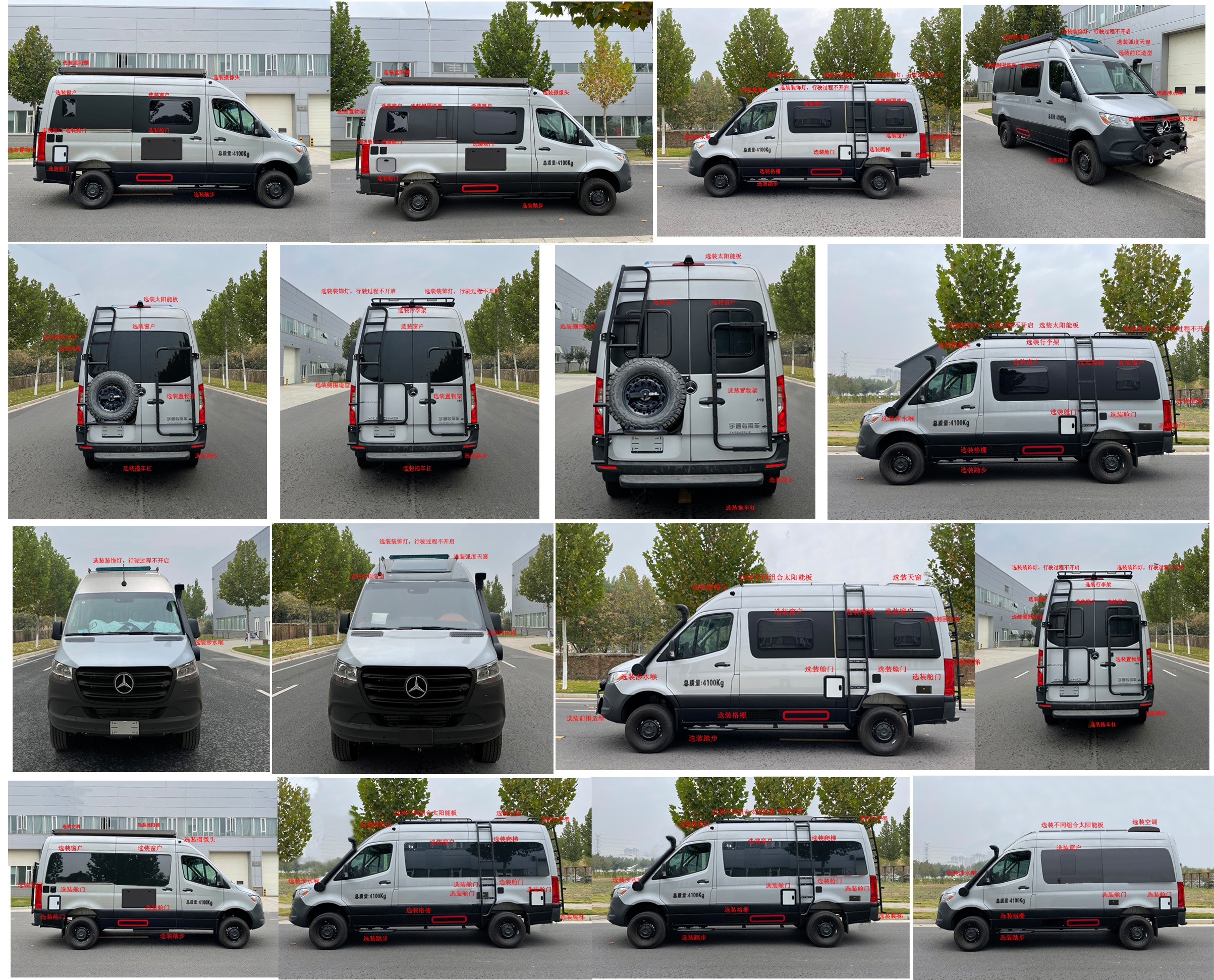 1.该车配备卧具、厨具、卫生设施等旅居生活设施,用于旅行宿营;2.选装高配置时整备质量3700kg或3800kg,选装标准配置时整备质量3650kg或3550kg,选装简单配置时整备质量3455kg;整备质量3700Kg只对应2-5额定载客,整备质量3800Kg只对应2-4额定载客;3.安装不同形式换气扇、遮阳棚、顶行李架、不同形式太阳能板时整车高度为2815mm或2865mm或2920mm或2975mm或3030mm或3090mm;安装不同侧围造型、爬梯时整车宽度为2025mm或2060mm或2100mm;安装后部装踏板时对应后悬1275mm,车长5995mm;4.车辆前部可选装涉水喉、弧度天窗、装饰灯、底盘防护,车顶可选装换气扇、天窗、行李架、太阳能板、前顶造型,车身两侧可选装窗户及舱门、轮毂、装饰灯、踏步、格栅、侧围造型、摄像头、遮阳棚、爬梯,车辆后部可选装窗户、爬梯、装饰灯、踏步、置物架、拖车杠;5.车内可选装不同型式床铺、电磁炉、卫生间;6.该车以裙边结构作为侧、后防护,侧防护下边缘离地高度450mm,后防护下边缘离地高度450mm;7.ABS型号:ABS ESP 8.1;ABS生产企业:BOSCH;发动机净功率值:140kW;8.车辆前部可选装装饰工作灯,装饰工作灯行驶过程中不可开启;9.该车型可选装ETC车载装置;10.该车选装牵引挂车,准拖挂车总质量为2000kg,牵引杆深入量为160mm,牵引杆不影响整车长度。 |