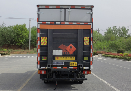 该车为危险品货物运输车,用于运输具有独立容器(瓶)包装的介质类项号为2.1,2.2,运输易燃气体时挂2.1类警示牌,运输非易燃无毒气体时挂2.2类警示牌;厢体顶部封闭,不可开启。侧/后防护材料为Q235,侧/后防护均采用螺栓连接,后防护结构为圆柱体,直径100mm,下边缘离地高380mm;起重尾板收起状态时的水平长度为280mm,尾板质量为350kg。安装限速装置,限速80km/h;仅采用排气管前置,前轮盘式制动器,子午线轮胎的底盘;转向轮安装轮胎爆胎应急防护装置,该车安装带有卫星定位功能的行驶记录仪;该车可选装直接供电ETC车载装置.ABS系统型号:APG3550500A,ABS系统生产厂家:浙江亚太机电股份有限公司;选装ABS系统型号:3550B500,ABS系统生产厂家:浙江亚太机电股份有限公司;选装ABS系统型号:VIE ABS-II,ABS系统生产厂家:浙江万安科技股份有限公司。发动机与油耗申报值对应(L/100km)关系为:JX493ZLQ6D/10.75。选装不带起重尾板(不带起重尾板时后防护材料Q235,焊接连接,截面尺寸50×100mm,下边缘离地高度400mm);选装不同厂家尾板及样式。整备质量包括灭火器、随车工具,不包含备胎;复合板结构厢体:底板材质为Q235,厚度3mm,侧板、顶板为外冷扎钢板+中间阻燃泡沫+内纯铝板),厚度42mm;货厢最大重量为1170kg(包含侧防护,五金件,防静电胶皮). |