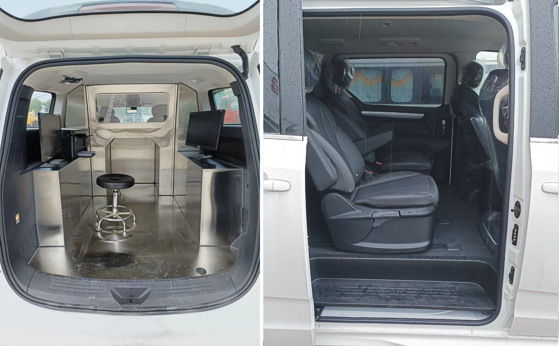 聚尘王牌上汽大通流动服务车在外观时尚霸气造型圆润流畅,可有效降低风阻系数,整车外形尺寸为5198×1980×1928(mm),厢体采用玻璃钢复合车身结构及阻燃保温材料,做工精细;房厢内部配置齐全。