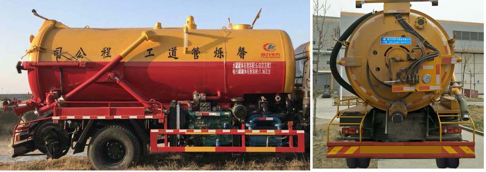 该车装有取力器,高压水泵,高压水管,高压泵头,真空吸污泵以及水罐,吸污罐,用于清洗和吸污;水罐罐体有效容积:6.63立方米,罐体外形尺寸(长×直径)(mm):2250×1850;吸污罐罐体有效容积:7.36立方米,罐体外形尺寸(长×直径)(mm):2950×1850; 水罐和吸污罐为两个独立罐体,两罐不能同时满载,轴距与后悬的关系为(mm):5000/2070,4700/2370,4500/2570;防护材料:Q235A碳钢,连接方式:左右侧面及后下部防护均采用焊接连接,后部防护断面尺寸(mm):280×50,后部防护离地高度(mm):450;随底盘选装驾驶室, 选装外形变化,ABS型号:3631010-C2000,4460046440;生产厂家:东科克诺尔商用车制动系统(十堰)有限公司,威伯科汽车控制系统(中国)有限公司,选用轮胎以及层级: 9.00R20(16PR),10.00-20(16/18PR),10.00R20(14/16/18PR),10R22.5(16PR),275/80R22.5,275/70R22.5(16/18PR),295/80R22.5, 选装新款驾驶室。 |