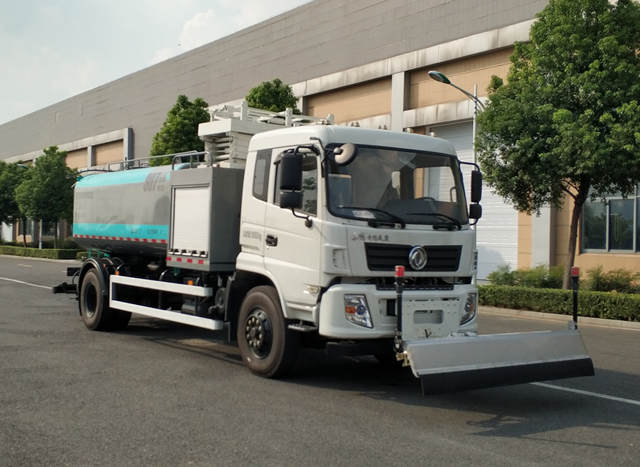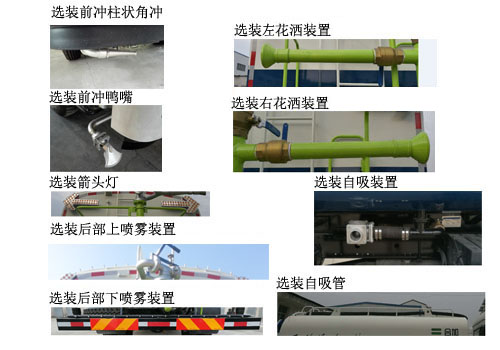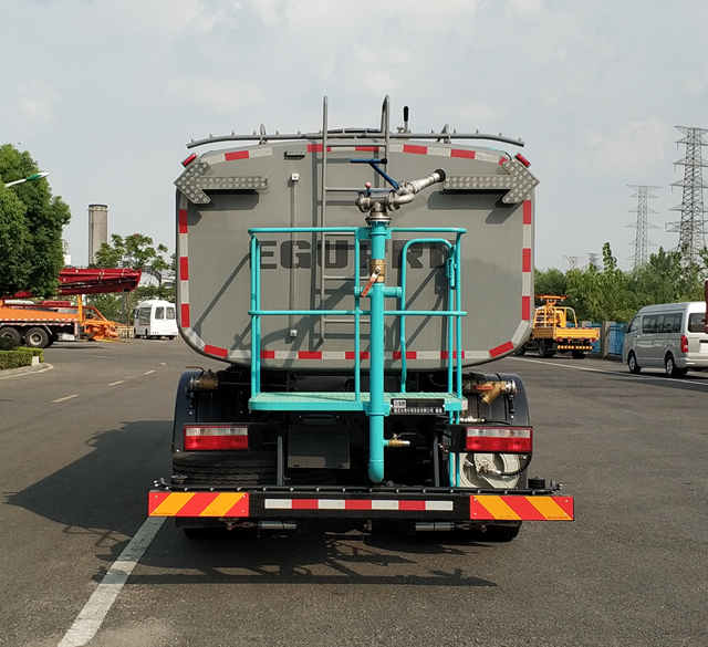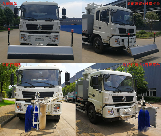选用5100mm轴距、1940前轮距、1860后轮距底盘,装有ABS,ABS的型号可以为ABS-E 4S/4M,生产厂为威伯科汽车控制系统(中国)有限公司,也可以为3631010-C2000,生产厂为东科克诺尔商用车制动系统(十堰)有限公司.该车型工作装置有4种配置:A(前喷架),B(前喷架+升降平台),C(护栏清洗),D(护栏清洗+升降平台);各配置外形尺寸高/前伸/额定载质量/整备质量对应关系:配置A:3000/1200/9090/8715,罐体外形尺寸(长度×长轴×短轴)(mm):4080×2280×1470,有效容积:9.54立方米;配置B:3250/1200/8490/9315,罐体外形尺寸(长度×长轴×短轴)(mm):3800×2280×1470,有效容积:8.91立方米;配置C:3000/1200/9090/8715,罐体外形尺寸(长度×长轴×短轴)(mm):4080×2280×1470,有效容积:9.54立方米;配置D:3250/1200/8490/9315,罐体外形尺寸(长度×长轴×短轴)(mm):3800×2280×1470,有效容积:8.91立方米;运输介质:水,密度1000千克/立方米;侧面防护装置的材料为铝合金,连接方式为螺栓连接;后防护装置材料为Q235A,连接方式为螺栓连接,断面尺寸为140×60mm,离地高度为490mm,可选装前冲、鸭嘴、后箭头指示灯、后部上、下喷雾、左、右花洒、自吸和自吸管等装置;专用装置由清洗装置、前喷装置、护栏清洗装置、升降平台及罐体等组成,专用功能为道路清洗、保洁、护栏清洗等作业. |