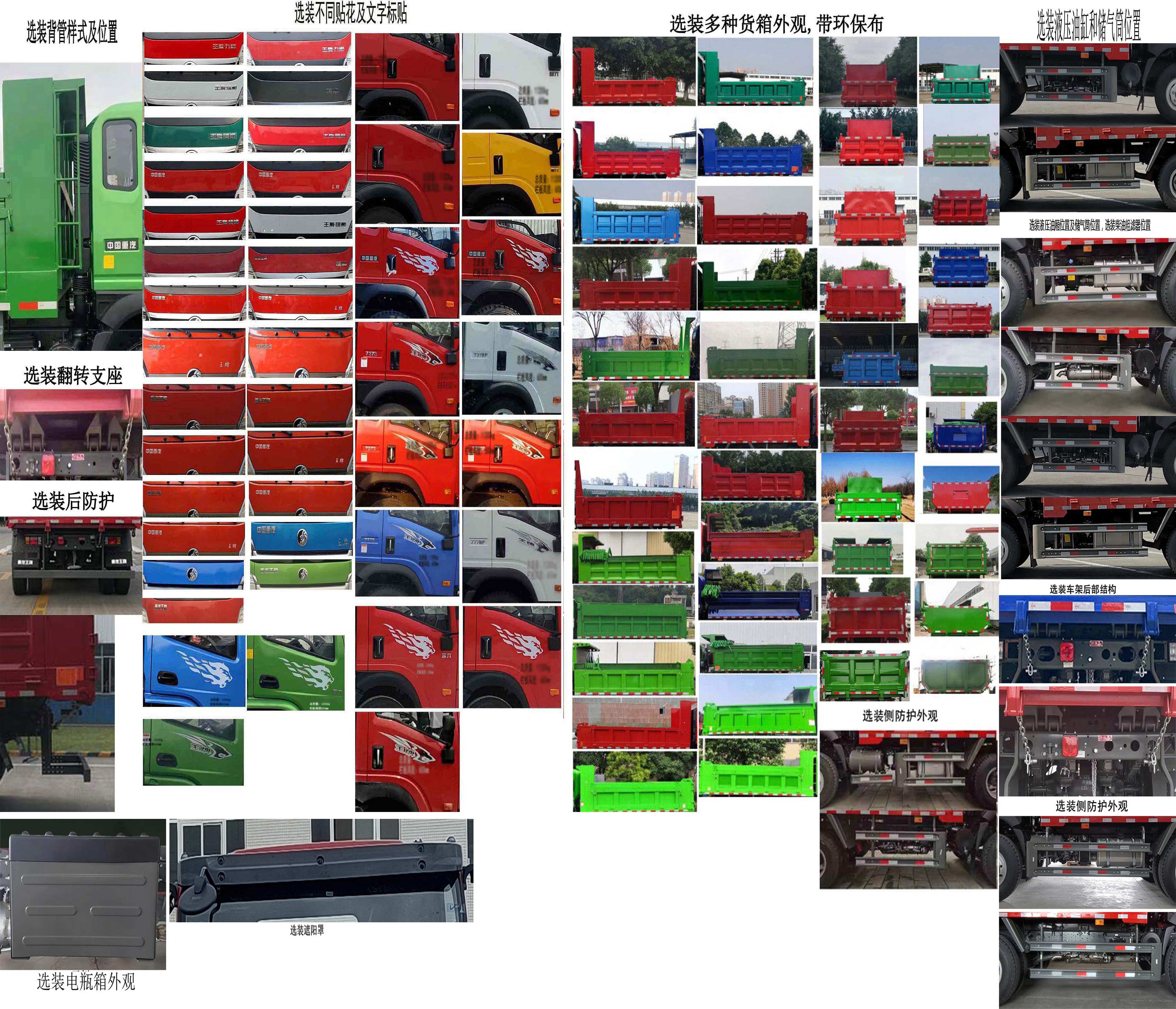 自卸方式为后卸;选装前面罩和前部灯具,选装货箱外观;选装不同贴花及文字标贴,选装背管样式及位置,选装翻转支座,选装货箱外观,带环保布,选装后防护,选装液压油缸和储气筒位置;扩展侧防护栏外观;选装车架后部结构;选装液压油箱位置及储气筒位置;选装柴油粗滤器位置,选装遮阳罩,选装电瓶箱外观;仅选用底盘的3350轴距,整车长/货箱长/后悬对应关系:5995/3800/1365,6135/3940/1505;WP4.1NQ190E61发动机油耗值21.0,WP3NQ160E61发动机油耗值21.3,D30TCIF4发动机油耗值21.0,D43TCIF2发动机油耗值20.0,YCS04180-68发动机油耗值21.0,WP3NQ170E62发动机油耗值21.0;;ABS型号为::CM4XL-4S/4M、VIE ABS-II,生产厂家为:广州瑞立科密汽车电子股份有限公司、浙江万安科技股份有限公司。防护栏均采用Q235钢板压制成型,侧防护采用螺栓连接方式,后防护采用螺栓连接方式;后防装置下边缘的最大离地高度为480mm,断面尺寸为120mm×20mm,选装后防护采用Q235钢板压制成型,采用螺栓连接方式;后防装置下边缘的最大离地高度为480mm,断面尺寸为120mm×60mm或120mm×50mm。该车可选装车载ETC装置。 |