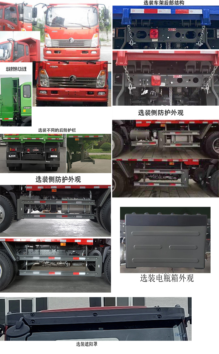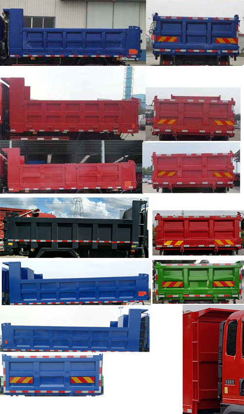 倾卸方式为后卸;选装货箱外观,选装货箱前、侧、后边板不同横、竖筋数量的多种结构形式外观;选装前面罩、前部灯具、保险杠及后视镜;选装背管样式及位置;选装不同贴花及文字标贴;选装侧防护外观;选装车架后部结构,选装电瓶箱外观,选装遮阳罩;该车装有卫星定位功能的行驶记录仪;防护栏均采用Q235钢板滚压成型,均采用螺栓连接方式;后防装置下边缘的最大离地高度为480mm,断面尺寸为120mm×20mm;120mm×60mm、120mm×50mm;发动机WP4.1NQ190E61油耗申报值为27.5,D30TCIF4油耗申报值为27.5,D43TCIF2油耗申报值为27.5,D45TCIF2油耗申报值为27.5,YCS04200-68油耗申报值为27.5,YCS04180-68油耗申报值为27.5,WP3NQ160E61油耗申报值为27.0;ABS型号为:VIE ABS-II,生产厂家为:浙江万安科技股份有限公司; |
