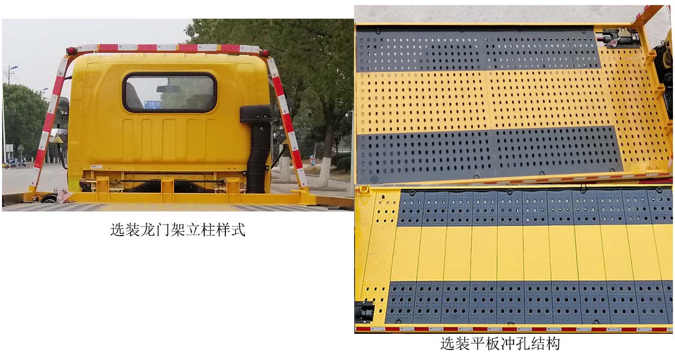 1.主要专用装置为液压绞盘,平板,用于道路清障.该车不具备拖牵功能;2.侧/后防护材料为Q235,侧防护采用螺栓连接;后防护采用焊接连接,后防护截面尺寸:100×50mm,下边缘离地高:380mm;3.额定载质量为1500kg;4.ABS系统型号/生产企业为:XH-KQ4S4M-E01/广州市西合汽车电子装备有限公司,CM4XL-4S/4M/广州瑞立科密汽车电子股份有限公司,VIE ABS-Ⅱ/浙江万安科技股份有限公司;4该车整备质量包括随车工具,三角垫木,不含备胎;5.选装尾部结构造型;6.随底盘选装驾驶室前脸造型;7.随底盘选装驾驶室外部造型,选装轮毂;选装龙门架立柱样式,选装平板冲孔结构 |