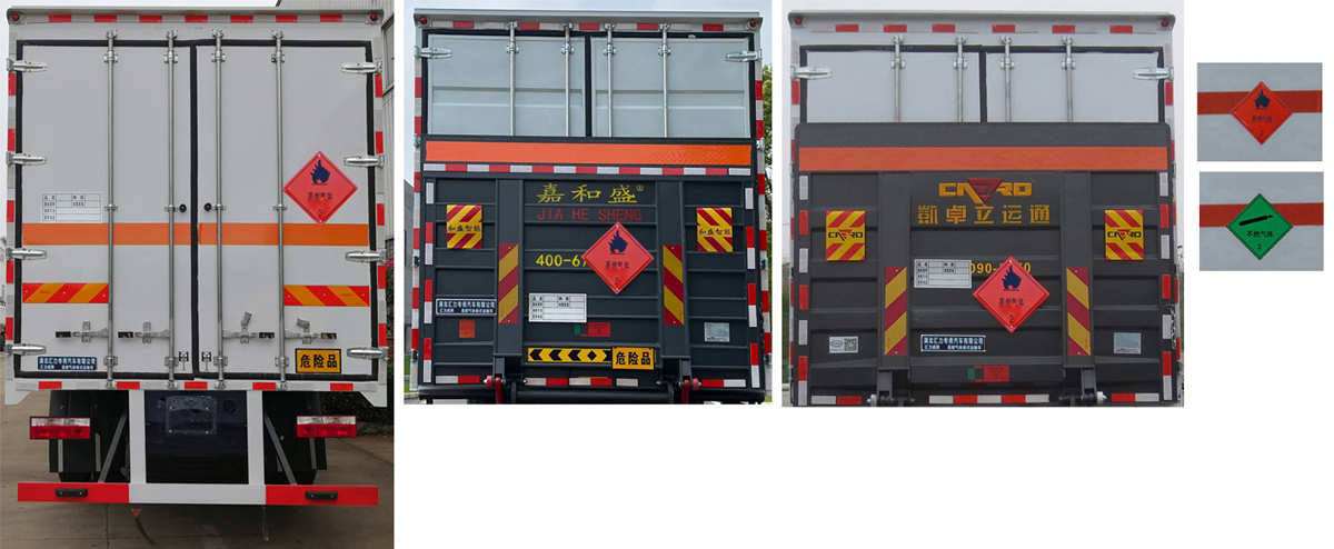 该车为危险品货物运输车, 运输独立容器(瓶)包装的货物,危险货物类项号:2.1,2.2;运输易燃气体时挂2.1类警示牌,运输非易燃无毒气体时挂2.2类警示牌;厢体顶部封闭,不可开启。侧/后防护材料为Q235,侧防护采用螺栓连接,后防护采用焊接加螺栓连接,后防护结构为圆柱体,直径120mm,下边缘离地高480mm;起重尾板收起状态时的水平长度为300mm,尾板质量为550kg。安装限速装置,限速80km/h;仅采用排气管前置,前轮盘式制动器,子午线轮胎的底盘;转向轮安装轮胎爆胎应急防护装置,后轴采用空气悬架,该车安装带有卫星定位功能的行驶记录仪;该车可选装直接供电ETC车载装置.EBS系统生产厂家,型号:襄阳东风隆诚机械有限责任公司,EBS/ESC-d.发动机与油耗申报值对应(L/100km)关系为:B6.2NS6B230/26.3,D4.5NS6B220/26.6,YCS04200-68/26.4,CY4SK761/26.8。选装不带起重尾板(不带起重尾板时后防护材料Q235,焊接加螺栓连接,截面尺寸60×120mm,下边缘离地高度470mm)。 |