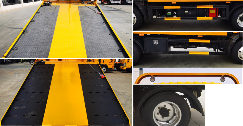 该车不具备拖牵功能,无托举质量。主要装置为平板,液压绞盘等组成,主要用于道路故障车辆,城市违章车辆及抢险救援等.ABS型号厂家为YF8/武汉元丰汽车电控系统股份有限公司.侧面防护装置材料材质:Q235,连接方式:螺栓连接。后防护装置材质:Q235,后防护连接方式:焊接连接,截面尺寸(高×宽):100×50mm,离地高360mm.随选装驾驶室及铝合金轮毂;整备质量不包含备胎,灭火器,选装上装平板结构样式;选装侧防护平面结构,材质:Q235,连接方式:螺栓连接。选装上装平板不同材质;选装龙门架照明灯具,该灯具仅在停车作业时使用;选装油箱、液压油箱、排气后处理系统样式及安装位置;选装弧形挡泥板。 |