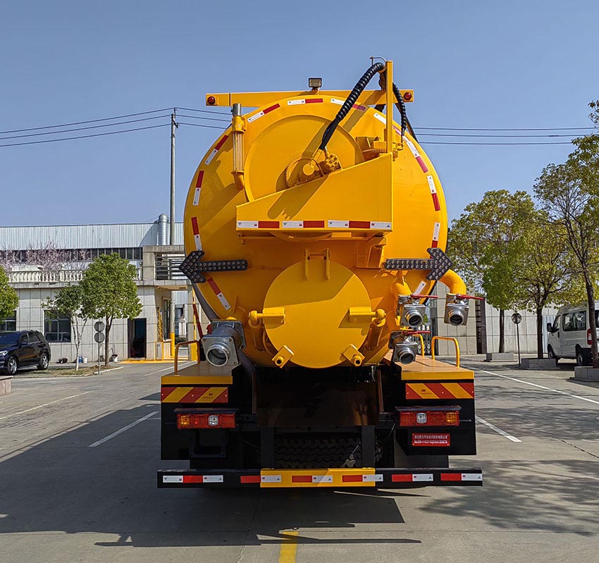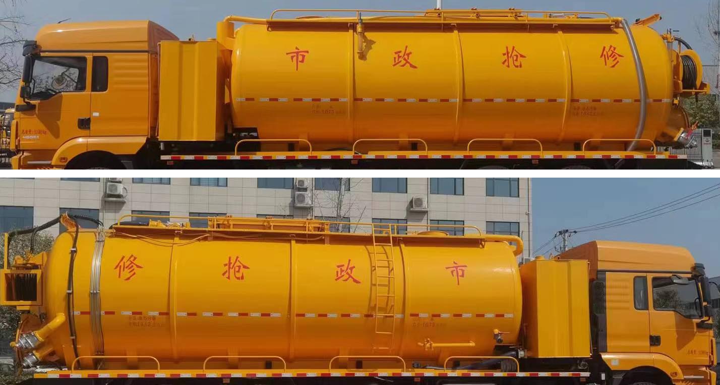 聚尘王牌陕汽德龙国六23方清洗吸污车的外观简单大气,外形尺寸为12000,11800×2550×3998(mm),额定上户吨位为9870,9805(kg),总质量为31000(kg),整车上装罐体分为污水罐和清水罐两部分,污水罐在中间,清水罐在污水罐的两侧,罐体材料全部采用优质武钢碳钢板制作而成,封头一次压铸成型;整车配备进口高压清洗泵和优质国产吸污泵,吸力大,吸程远,可以将水道内的淤积物轻而易举的搞定。