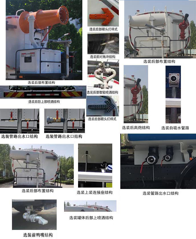 1、侧面防护装置材料材质为铝合金,连接方式为螺栓连接,后下部防护装置的材料材质为Q345,连接方式为螺栓连接,后下部防护装置的断面尺寸为(mm):140×80,最大离地高度为460mm;2、随底盘,ABS型号:ABS-E或446 004 6300,ABS生产企业:采埃孚商用车系统(青岛)有限公司;选装EBS,EBS系统控制器生产企业:采埃孚商用车系统(青岛)有限公司司,型号:EBS3;选装限速装置,限速装置限速89 km/h;3、仅用轴距(mm):4325+1350,4300+1400;4、车辆后部箭头灯仅在作业状态下使用;5、仅采用发动机:MC07.29-60、MC07.27-60、MC07H.33-60、MC07.31-60、MC07H.35-60、WP10H400E62、WP8.350E61、WP9H350E62、MC11.40-61;6、随底盘,选装驾驶室,选装前面罩,选装踏步和侧翼子板配色,选装油浴式空滤器,选装保险杠外观,选装高位保险杠,选装车身侧部标识,选装四方位影像系统,选装铝合金轮辋,选装踏步,选装前拖钩,车辆前部logo及饰件颜色可选择金色;7、选装后部布置结构;选装后防上部喷洒结构;选装管路出水口结构;选装前对角冲结构;选装后部箭头灯样式;选装后部智能喷洒结构;选装上装连接座结构;选装罐体后部上喷洒结构;选装后高炮结构;选装自吸水管路;选装管路出水口结构;选装前鸭嘴结构;8、有效容积为18.5立方米,罐体总容量为19立方米,罐体外形尺寸(长×宽×高)(mm):6200×2400×1700;8、该车专用装置为抑尘雾炮,主要用途为喷洒降尘等. |