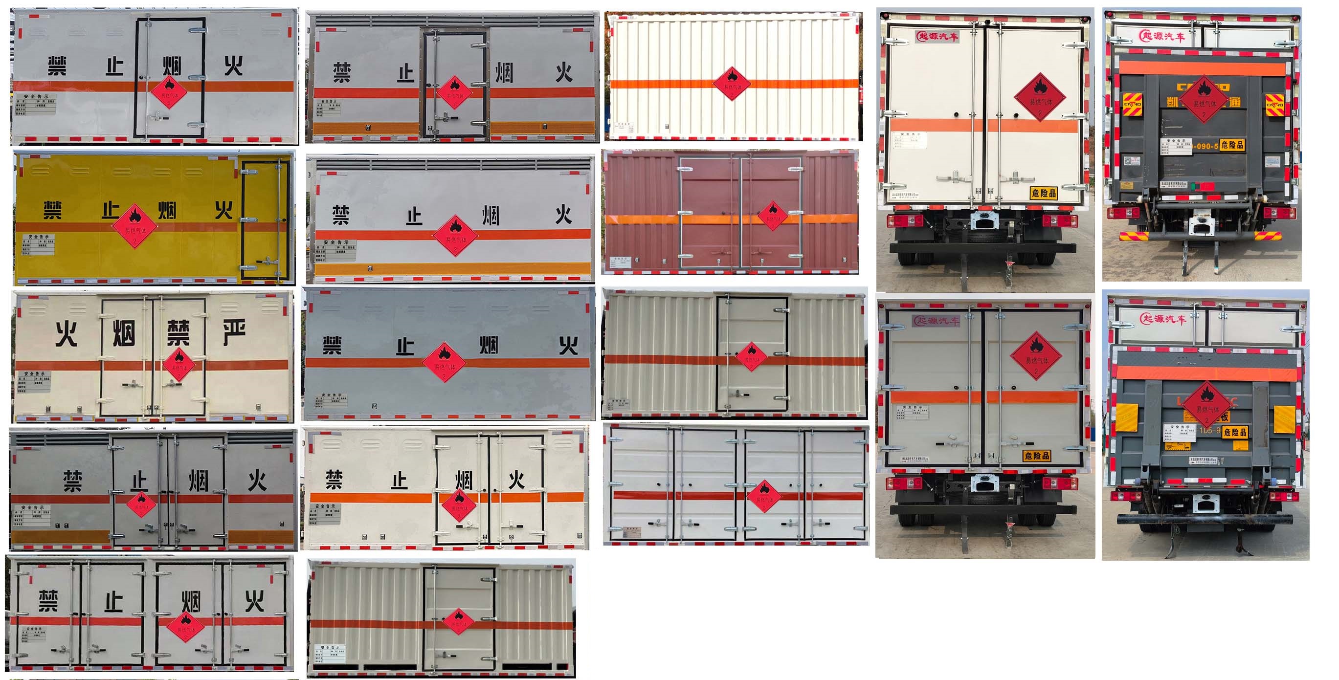 备注 | 厢体顶部封闭,不可开启;该车为危险品运输车,运输具有独立容器(瓶,袋,桶)包装的易燃气体,危险货物类项号:2.1,2.2;运输易燃气体时挂2.1类警示牌,运输非易燃无毒气体时挂2.2类警示牌;仅选用3300mm轴距,发动机/油耗申报值(L/100km)对应关系为:CA4DB1-11E6/11.21,CA4DB1A14E68/11.46;侧防护材质为Q235,螺栓加焊接连接,装有液压尾板时后防护为圆形材质为Q235,螺栓加焊接连接,截面尺寸(mm)120,离地高度:360mm;尾板收起状态水平长度为280mm,尾板质量为350kg;ABS防抱死制动系统生产厂家/型号:浙江万安科技股份有限公司/VIE ABS-II;该车前轴安装盘式制动器,前置排气管,安装子午线轮胎;随底盘安装限速装置,限速79km/h.转向轮安装爆胎应急防护装置;安装具有卫星定位功能的行驶记录仪;可选装直接供电ETC车载装置;选装不带液压尾板时后防护材质为Q235,螺栓加焊接连接,断面尺寸(宽×高):50×100(mm),离地高度:430mm;该车整备质量不包含备胎,包含灭火器,随车工具等;整备质量/厢体重量(Kg)对应关系:3205/960,3100/850,2915/655.夹层结构车厢墙板材质:外板均为彩钢板,中间挤塑板,内板为镀锌钢板或铝板.车厢前板,顶板,侧板,后门板厚度均为40mm;瓦楞板结构厢体,底板材质为Q235,厚度3mm,侧板为Q235,厚度1.2mm,车厢前板,顶板,侧板,后门板厚度为40mm;选装不同厂家尾板以及尾板外观,无尾板后部样式,选装货厢侧面样式. |
