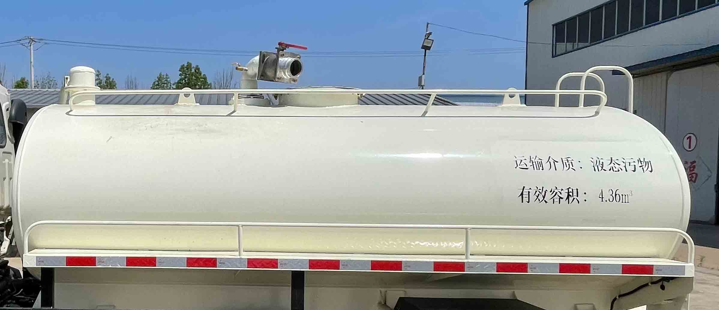 主要专用装置为吸粪总成,用于抽排污水、粪便、油污、泥浆等各种流体;罐体总容量:4.5立方米,罐体有效容积:4.36立方米,罐体外形尺寸(长轴×短轴×长度)(mm):1695×1150×3450.介质名称:液态污物,介质密度:800千克/立方米.侧防护及后防护装置材料均为Q235,连接方式均为螺栓连接,后防护装置截面尺寸为100×50mm,离地高度为380mm;ABS系统控制器型号为CM4XL-4S/4M,ABS系统控制器生产企业为:广州瑞立科密汽车电子股份有限公司;可选装直接供电方式ETC车载装置.选装罐体上方布局,随底盘选装驾驶室,选装新款前格栅,选装前保险杠风格,选装前围风格. |