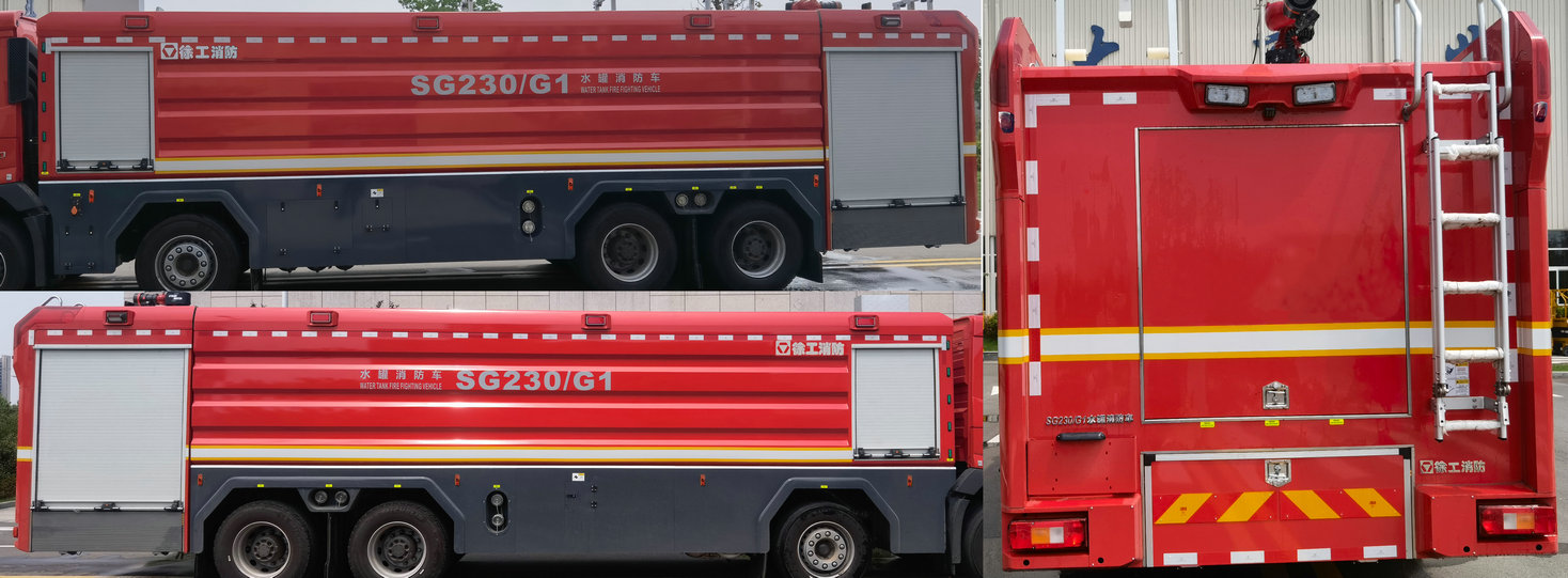 徐工牌前四后八23方水罐消防车底盘方面,动力十足,能适应特殊的地理环境需要,随车配备了手抬机动泵、吸水管、灭火器、水袋、消防战斗衣等器材装备。