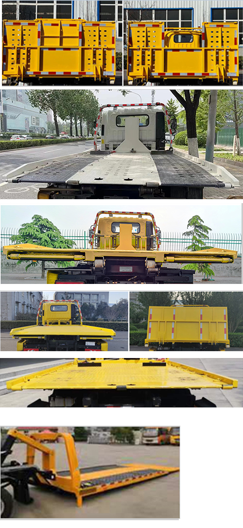 该车专用装置为平板,液压绞盘.主要用于道路清障作业;侧防护装置材料为Q235,连接方式为螺栓连接;后下部防护装置由专用装置代替,离地高度430mm;ABS系统控制器生产企业/型号为:浙江万安科技股份有限公司/VIE ABS-II;该车型可选装ETC车载装置.整备质量不含备胎、灭火器,包含停车楔、随车工具;该车无托牵功能.随底盘选装驾驶室.选装工作装置外观样式. |