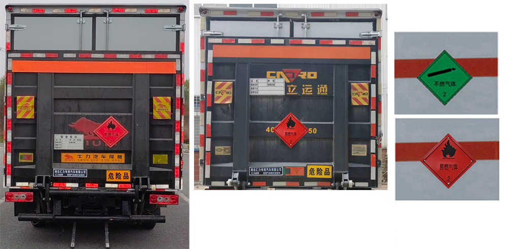 该车为危险品货物运输车,用于运输具有独立容器(瓶)包装的介质类项号为2.1,2.2,运输易燃气体时挂2.1类警示牌,运输非易燃无毒气体时挂2.2类警示牌;厢体顶部封闭,不可开启。侧/后防护材料为Q235,侧/后防护均采用螺栓连接, 后防护材料Q235,截面尺寸50×100mm,下边缘离地高度440mm;安装限速装置,限速80km/h;仅采用排气管前置,前轮盘式制动器,子午线轮胎的底盘;转向轮安装轮胎爆胎应急防护装置,该车安装带有卫星定位功能的行驶记录仪;该车可选装直接供电ETC车载装置.ABS系统型号:ABS-VI.E;生产企业:广州瑞立科密汽车电子股份有限公司.ABS系统型号:ABS-E;生产企业:威伯科汽车控制系统(中国)有限公司。发动机与油耗申报值对应(L/100km)关系为:D25TCIF1/11.16,F2.5NS6B131/11.27,Q25-152E60/11.02。选装带起重尾板(带起重尾板时后防护结构为圆柱体,连接方式:螺栓连接,直径100mm,下边缘离地高400mm); 起重尾板收起状态时的水平长度为280mm,尾板质量为350kg。选装不同厂家尾板及样式。整备质量包括灭火器、随车工具、备胎;复合板结构厢体:底板材质为Q235,厚度3mm,侧板、顶板为外冷扎钢板+中间阻燃泡沫+内纯铝板),厚度42mm;货厢最大重量为1063kg. |