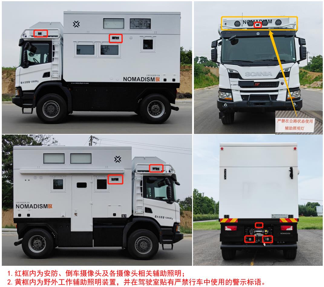 1、车辆裙板结构作为侧面防护装置,材质为高强度铝合金,后防护材质为Q235A,断面尺寸φ140mm,离地高度:440mm,与车架纵梁螺栓连接;2、该车配备有桌椅,厨具,睡具(可由桌椅转化而来),卫生设施等旅居生活设施;3、ABS型号为:ABS-E,生产厂家为:威伯科汽车控制系统(中国)有限公司;4、发动机DC09 126 L02最大净功率为235KW;5、该车具有升顶拓展机构,拓展机构仅在驻车状态时使用;车头灯具为选装,仅限人员在野外非道路状况下工作和生活照明使用;6、该车可选装直接供电式ETC装置;7、后悬架为空气悬架. |