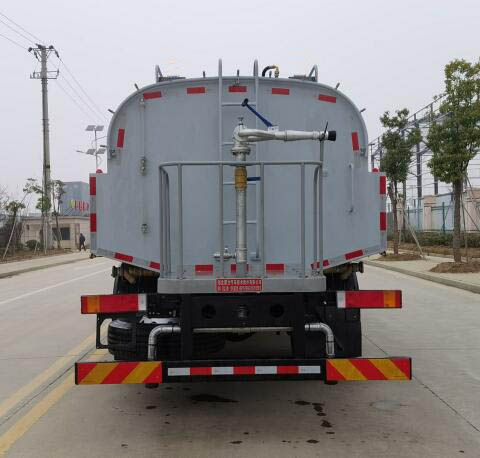随底盘选装驾驶室;选装罐体外观;带前冲洗架时整车长9200mm,前伸900mm,接近角14°;选装不带前冲洗架时,整车长为8300mm,无前伸,接近角17°;罐体尺寸(长度×长轴×短轴)(mm):4000×2180×1450,罐体有效容积9.03立方米;运输介质:水,密度:1000千克/立方米;仅采用4500mm轴距底盘;侧防护材料为铝合金型材6061-T5,螺栓连接;后防护材料为Q235,焊接连接,截面尺寸为:150×50(mm),离地高度为:500(mm);ABS型号/生产厂家:3631010-C2000/东科克诺尔商用车制动系统(十堰)有限公司,ABS 8/东科克诺尔商用车制动系统(十堰)有限公司,4460046450/威伯科汽车控制系统(中国)有限公司;该车专用装置主要是罐体和清洗机,用于路面冲洗作业. |