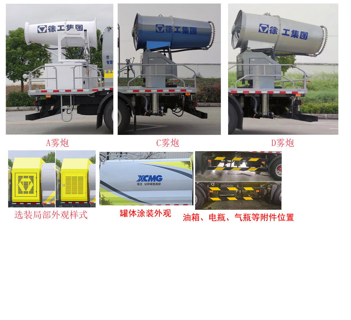 该车专用装置为喷雾系统装置、储液箱,用于道路广场或固定场所除霾降尘作业;仅选用3950mm轴距,随底盘选装驾驶室;罐体有效容积8.6立方米,罐体尺寸(长轴×短轴×长度)(mm):2440×1750×2510,运输介质为抑尘剂,密度为900千克/立方米;车辆选装如下:1、选装A雾炮,车辆长度(mm)/后伸(mm)/高度(mm)/整备质量(kg)为:8255/480/3370/8240;2、选装B、D雾炮,车辆长度(mm)/后伸(mm)/高度(mm)/整备质量(kg)为:8535/760/3190/8550;3、选装C雾炮,车辆长度(mm)/后伸(mm)/高度(mm)/整备质量(kg)为:8240/465/3045/8445;选装局部外观样式;侧防护与后防护装置材质均为Q355B,连接方式均为螺栓连接,后防护截面尺寸为180×60mm,离地高度410mm;ABS系统生产厂家,型号 :焦作博瑞克控制技术有限公司,J ABS;襄阳东风隆诚机械有限责任公司,ABS/ASR-24V-4S/4M.随底盘选装限速装置,限速89km/h.选装局部外观样式、罐体涂装外观、底盘附件位置. |
