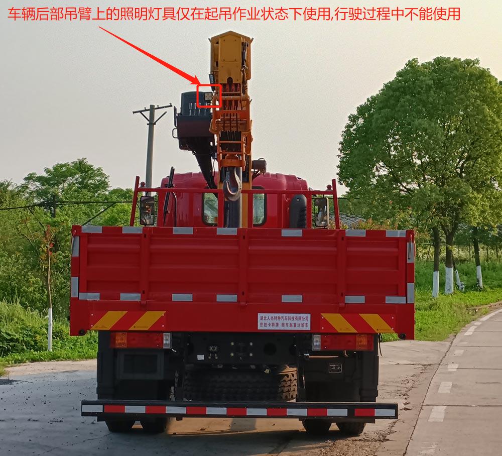 1.吊机型号/吊机质量(kg)/最大起升载荷(kg)为:STR175/3800/7000kg;2.侧防护材质:Q235,与副车架焊接连接;后部防护材质:Q235,与车架尾部螺栓连接;后部防护断面尺寸(高×宽):120×80(mm),离地高度485mm;3.该车安装具有卫星定位功能的行驶记录仪;4.ABS型号及生产厂家:ZQFB-V/西安正昌电子股份有限公司;5.发动机/油耗值(L/100km)对应关系:YCS04200-68/26.5;6.车辆后部吊臂上的照明灯具仅在起吊作业状态下使用,行驶过程中不能使用;7.该车型可选装直接供电式ETC车载装置. |