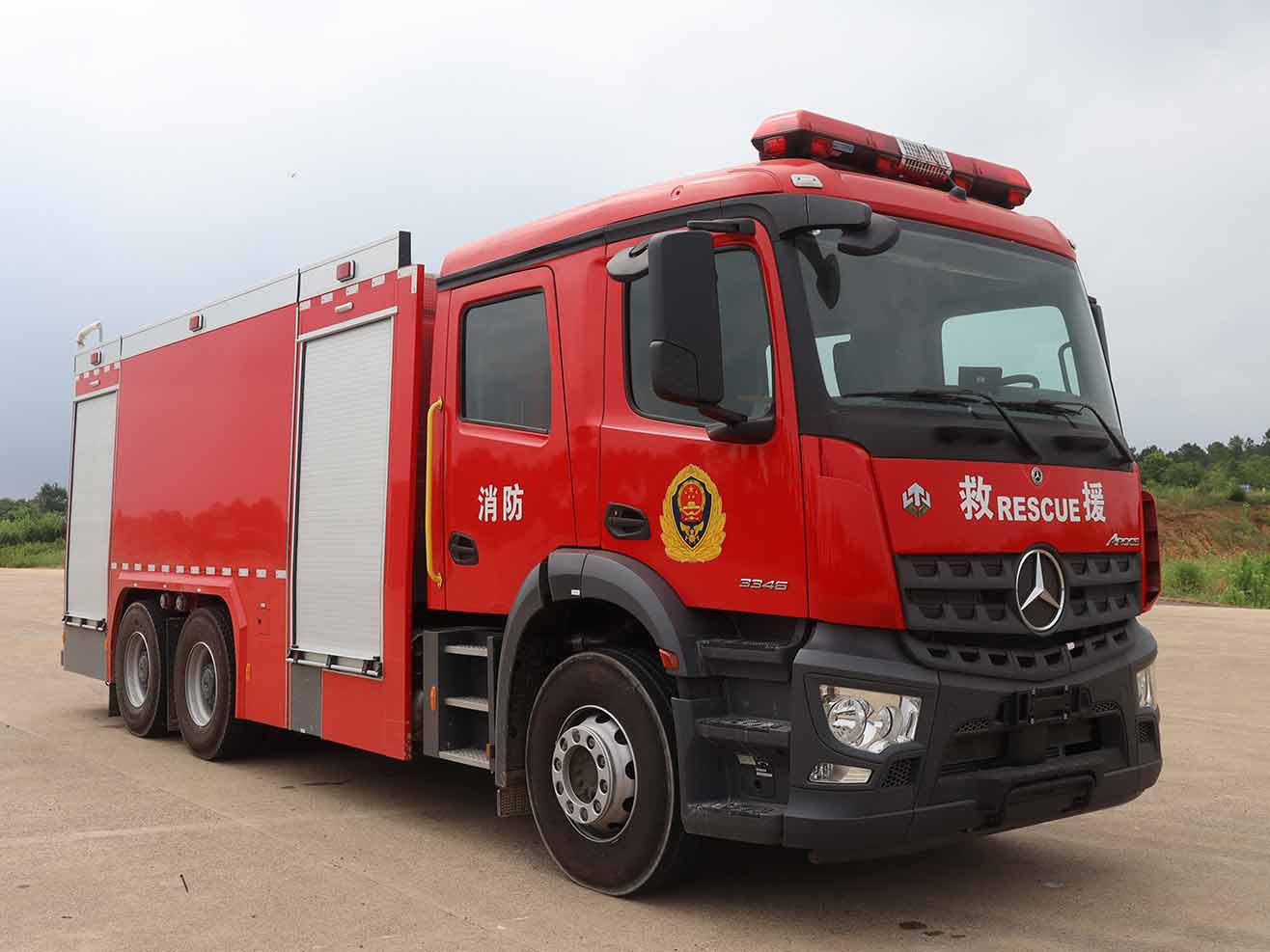 首先从它的外观开始,天河牌奔驰后双桥12.6方泡沫消防车整车外形尺寸为9630×2500×3750(mm),车型外观小巧,在老城区道路狭窄的地方也能很方便的进出,车身从正面看,前风窗占据整车车头的1/2,下半部分的方格型进气格栅,利于发动机的散热。车头正下方是防撞保险杠,采用加厚钢板材质,黑漆封釉,稳固防撞,保护车头。