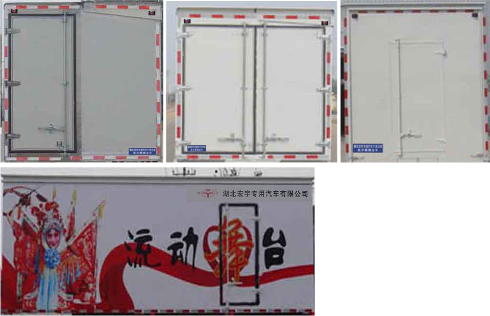 随底盘选装驾驶室,导流罩为选装件,选装后部门结构样式,选装厢体侧面开门样式。车厢顶棚封闭,并采用衍架结构,可升降,车厢两侧板可展开,与顶棚形成整车舞台顶棚;活动舞台板可折叠于车厢内,通过展开装置展后与固定舞台台面形成整车舞台台面;底盘大梁部分设有支撑装置。ABS型号/厂家为VIE ABS-Ⅱ/浙江万安科技股份有限公司,选装ABS型号/厂家:CM4XL-4S/4M /广州瑞立科密汽车电子股份有限公司。侧防护采用冷弯型钢/Q235-B,焊接连接,后防护采用冷弯型钢/Q235-B,焊接连接,后防护截面高度尺寸100mm,截面宽度尺寸50mm,下边缘离地高度480mm。该车作为流动演出的、可展开成为舞台。 |