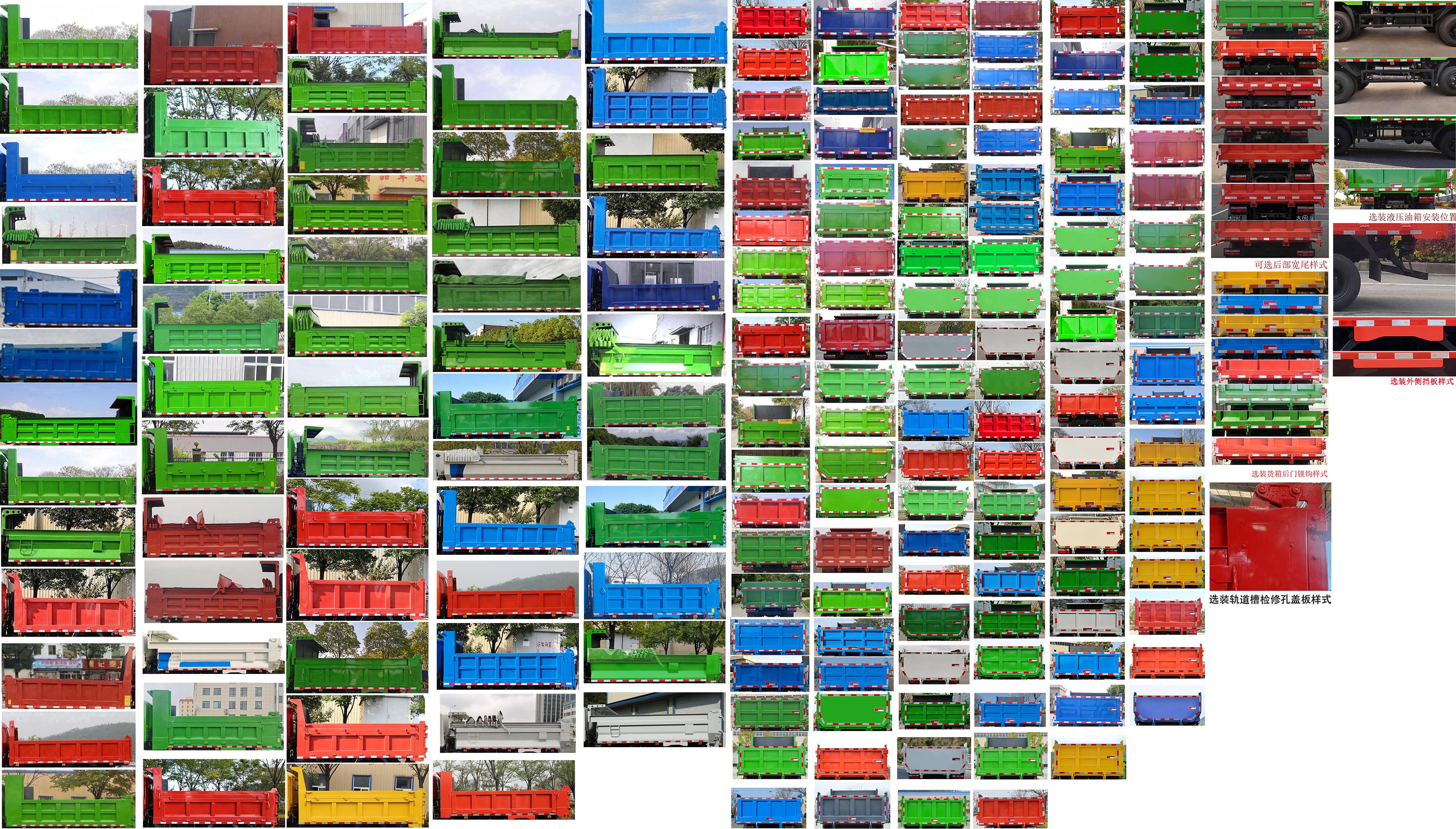 随底盘选装前保险杠,前面板及前部灯具样式,选装遮阳罩,选装单排驾驶室,选装轮圈样式,选装电瓶框、尿素罐和储气筒样式及安装位置,选装燃油箱样式,选装不同货箱样式,选装液压油箱安装位置,选装后部横梁样式,选装不带备胎;ABS型号:VIE ABS-II,CM4XL-4S/4M;ABS生产企业:浙江万安科技股份有限公司,广州瑞立科密汽车电子股份有限公司;该车型可选装ETC车载装置;发动机净功率值:YN25PLUS1/100;发动机/油耗值(L/100km)对应关系为:YN25PLUS1/21.2;侧、后防护装置材料均为Q235,侧防护焊接+螺栓连接;后防护焊接+螺栓连接,后防护离地高度为440mm,410mm,370mm,330mm,300mm,截面高度和厚度为100mm×50mm;自卸方式为后卸式;整车长度尺寸对应关系为:5350=1130+2860+1360,5400=1130+2860+1410,5520=1130+3000+1390,5670=1130+3200+1340,5840=1130+3200+1510,5900=1130+3300+1470,5995=1130+3300+1565,6050=1130+3300+1620,6100=1130+3300+1670,5350=1225+2860+1265,5490=1225+2860+1405,5600=1225+3000+1375,5700=1225+3000+1475,5780=1225+3200+1355,5840=1225+3200+1415,5995=1225+3300+1470,6050=1225+3300+1525,6100=1225+3300+1575,5780=1130+3200+1450,5100=1130+2860+1110,5150=1130+2860+1160,5200=1130+2860+1210. |