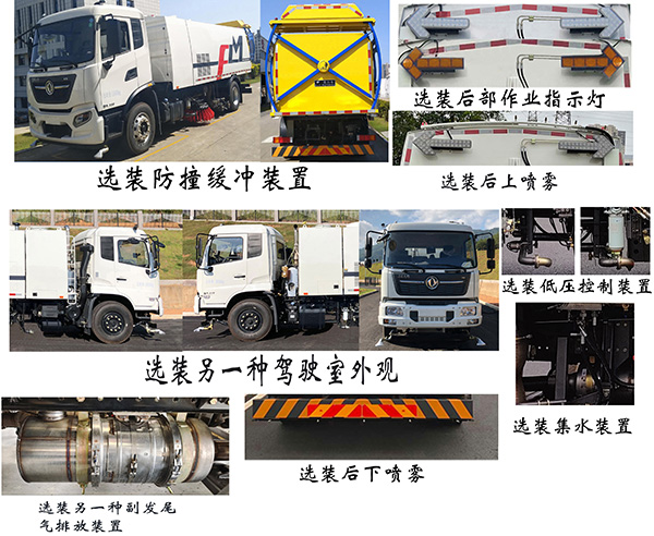 仅选用5300mm轴距。该车型有五种配置:配置A(标准配置)、配置B(选装单点清淤装置),配置C(选装前置护栏滚扫),配置D(选装防撞缓冲装置),配置E(选装前自动水炮),各配置整备质量(kg)/载质量(kg)/车辆长(mm)/前悬(mm)/车辆高(mm)/后伸(mm)对应关系如下:配置A:11830/5975/9030/1400/3070/0;配置B:11830/5975/9140/1540/3070/0;配置C:11830/5975/9955/2355/3070/0;配置D:12200/5605/9800/1400/3285/770;配置E:11830/5975/9480/1880/3070/0,以上5种装置均可选装:1、选装后部作业指示灯;2、后上喷雾装置;3、后下喷雾装置;4、扫盘单独控制;5、大流量后洒水装置;6、另一种副发尾气排放装置;7、低压控制装置;8、集水装置;9、新上装;以上9种选装配置引起的重量及整车尺寸变化可以忽略不计;专用装置代替侧防护;后防护装置的材料材质为:Q235B,连接方式为:螺栓联接;后防护装置的断面尺寸(宽×高)mm为:60×200,后防护离地高460mm;随底盘选装另一种驾驶室外观(此时配置A及配置D前悬1455mm,后悬2275mm);随底盘驾驶室选装:前雾灯、前面罩、前脸扰流罩、前保险杠及前部灯具、后组合灯、前视镜、后视镜、侧窗装饰板、不同结构的车门裙板、上车踏板型式,驾驶室顶部中间3个装饰灯为选装件;(3)ABS型号/生产厂家:3631010-C2000/东科克诺尔商用车制动系统(十堰)有限公司,ABS 8/东科克诺尔商用车制动系统(十堰)有限公司, 4460046450/威伯科汽车控制系统(中国)有限公司,J ABS/焦作博瑞克控制技术有限公司。 |