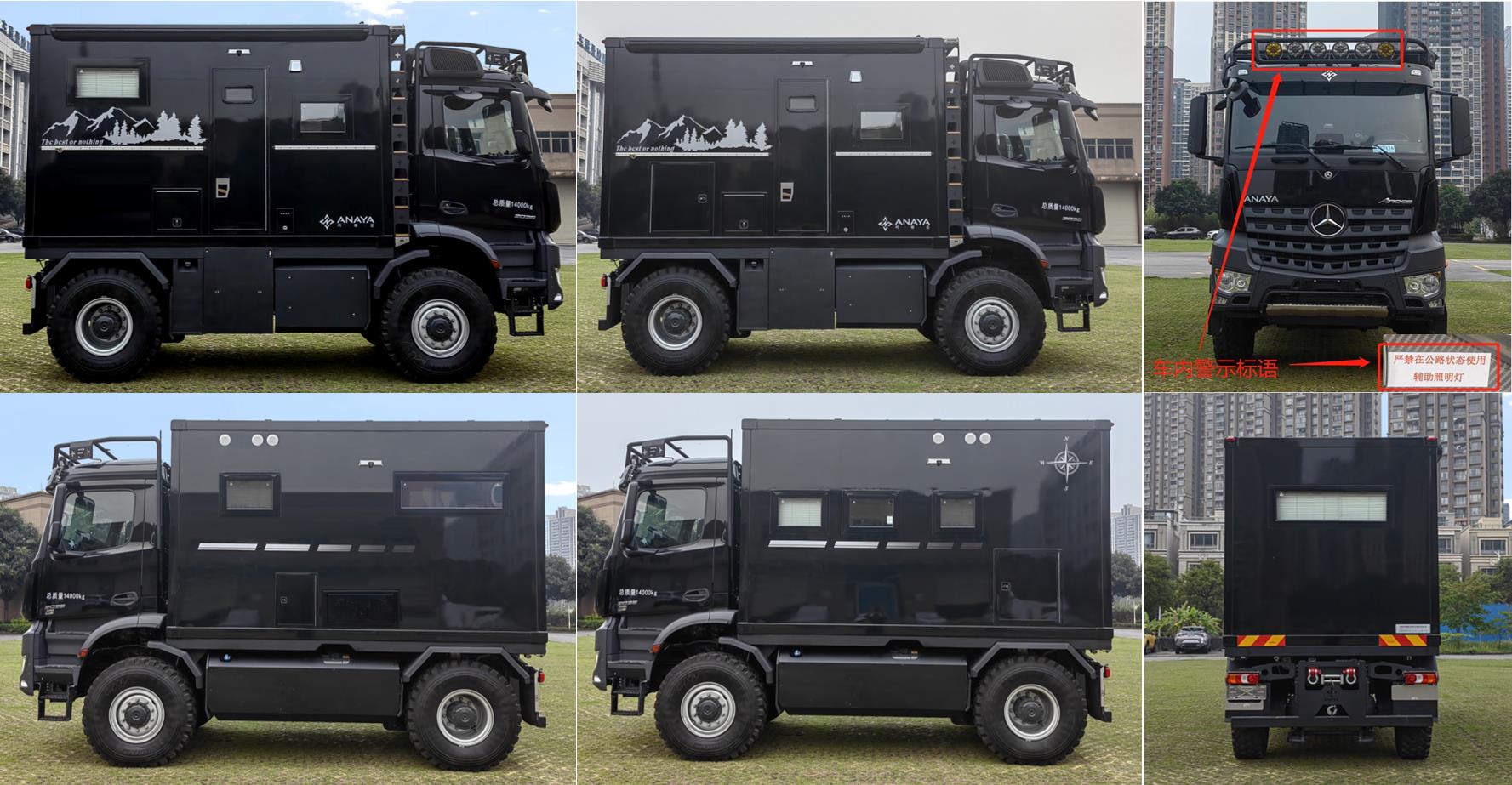 1、车辆裙板结构作为侧面防护装置,材质为高强度铝合金;后防护装置为矩形,材质为Q235A,断面尺寸(高×宽)mm:120×80,离地高度:495mm,连接方式:与车架纵梁螺栓连接;2、该车配备有桌椅,厨具,睡具,卫生设施等旅居生活设施;3、ABS型号为: EBS4+,生产厂家为: WABCO;4、发动机OM470LA.6-59的最大净功率为265KW;5、选装车头灯具,该灯具仅限人员在野外非道路状况下工作和生活照明使用;选装不同厢体外观样式;6、该车可选装直接供电式ETC装置;7、安装限速装置,限速100km/h;8、选装不同内部布局;未安装安全带的侧向座椅,行驶中不允许使用. |