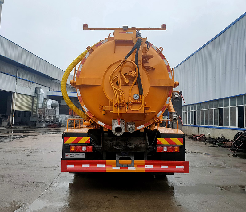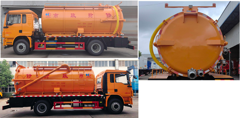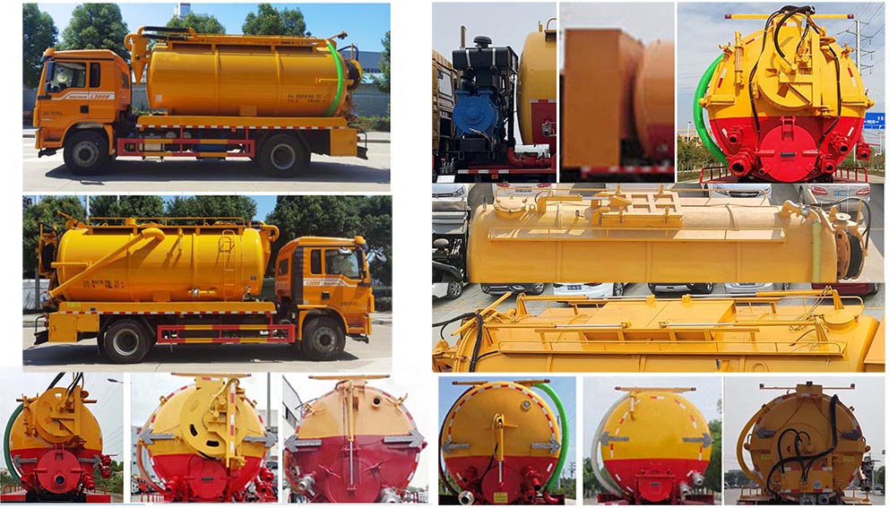 该车主要用于吸除清洗污浊物,主要装置为清洗吸污罐.罐体外形尺寸为(长×直径)(mm):5600(含直段长5000)×1950,其中罐体前段为清水罐(直段长2300mm);后段为污水罐(直段长2700mm),;污水罐罐体总容量7.39立方米,污水罐罐体有效容积7.05立方米,运输介质:液态污物;清水罐罐体总容量5.92立方米,清水罐罐体有效容积5.64立方米,运输介质:水.清洗时用清水罐,吸污时用污水罐,清洗和吸污功能不同时使用,两罐不能同时满载.侧,后防护装置材料材质均为Q235,连接方式:左右侧面及后下部防护均采用焊接连接,后下部防护断面尺寸(高×宽) (mm):230×50,后下部防护离地高度(mm):450.ABS系统生产厂家及型号分别为:西安正昌电子股份有限公司(型号:ZQFB-V);仅采用4700轴距改装,整车长(mm)/轴距(mm)/后悬(mm)的对应关系为:8400/4700/2360,8600/4700/2560,8800/4700/2760,9095/4700/3055.后轴悬架形式仅采用钢板弹簧.车辆后部安装照明灯,该灯在行驶过程中不点亮,仅在作业时使用.随底盘选装驾驶室图片.选装罐体结构,选装罐体顶部样式,选装罩壳样式,选装罐体前部安装水箱,选装副发动机外观,选装后部结构.选装车身侧面图片,选装车辆后部图片. |