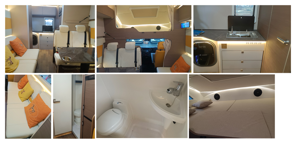 该车配备卧具、厨具、卫生设施等旅居生活设施,用于旅行宿营; 该车以裙边结构作为侧、后防护,后防护下边缘离地高度500mm; ABS系统控制器型号:BOSCH ABS9、BOSCH ESP9, ABS系统控制器生产企业:BOSCH公司; 该车安装有工作灯,行驶过程中不点亮,仅在驻车作业时起照明作用; 选装限速装置,选装限速装置时最高车速为100km/h; 侧向布置的座椅,行驶中不载人; 选装外观及内部布局样式,选装顶部空调. |