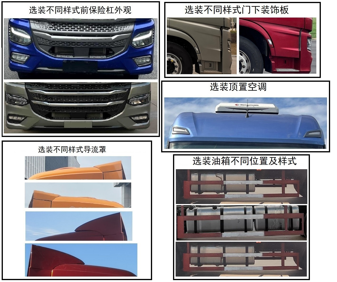 随底盘选装不同样式驾驶室,选装不同样式前保险杠外观,选装车门下装饰板,选装顶置空调,选装不同样式导流罩,选装油箱不同位置及样式,选装不同结构货箱,顶部封闭不可开启,选装不同发动机对应申报油耗值(L/100km)为:X12NS6B440/37.5,X12NS6B470/37.5,X12NS6B490/37.5,X13NS6B520/36.9,X13NS6B560/36.9,X13NS6B580/36.9,ABS型号/生产企业:CM4XL-4S/4M/广州瑞立科密汽车电子股份有限公司,选装EBS,EBS型号/生产企业:CM-EBS/广州瑞立科密汽车电子股份有限公司,侧防护装置材料:Q235,后防护装置材料Q235,后防护装置断面尺寸:120mm×60mm,后防护离地高度:480mm,侧防护装置连接方式:焊接,后防护装置连接方式:螺栓连接,选装限速装置,限速89km/h,安装具有卫星定位功能的行驶记录仪,该车型可选装ETC车载装置. |