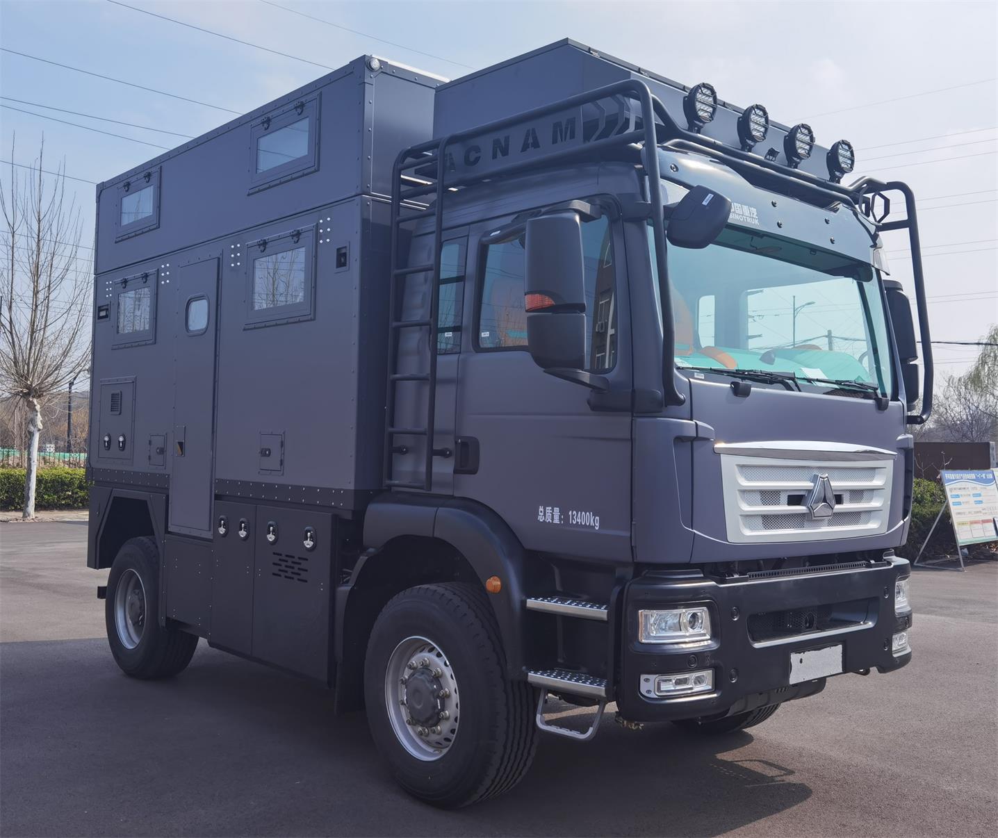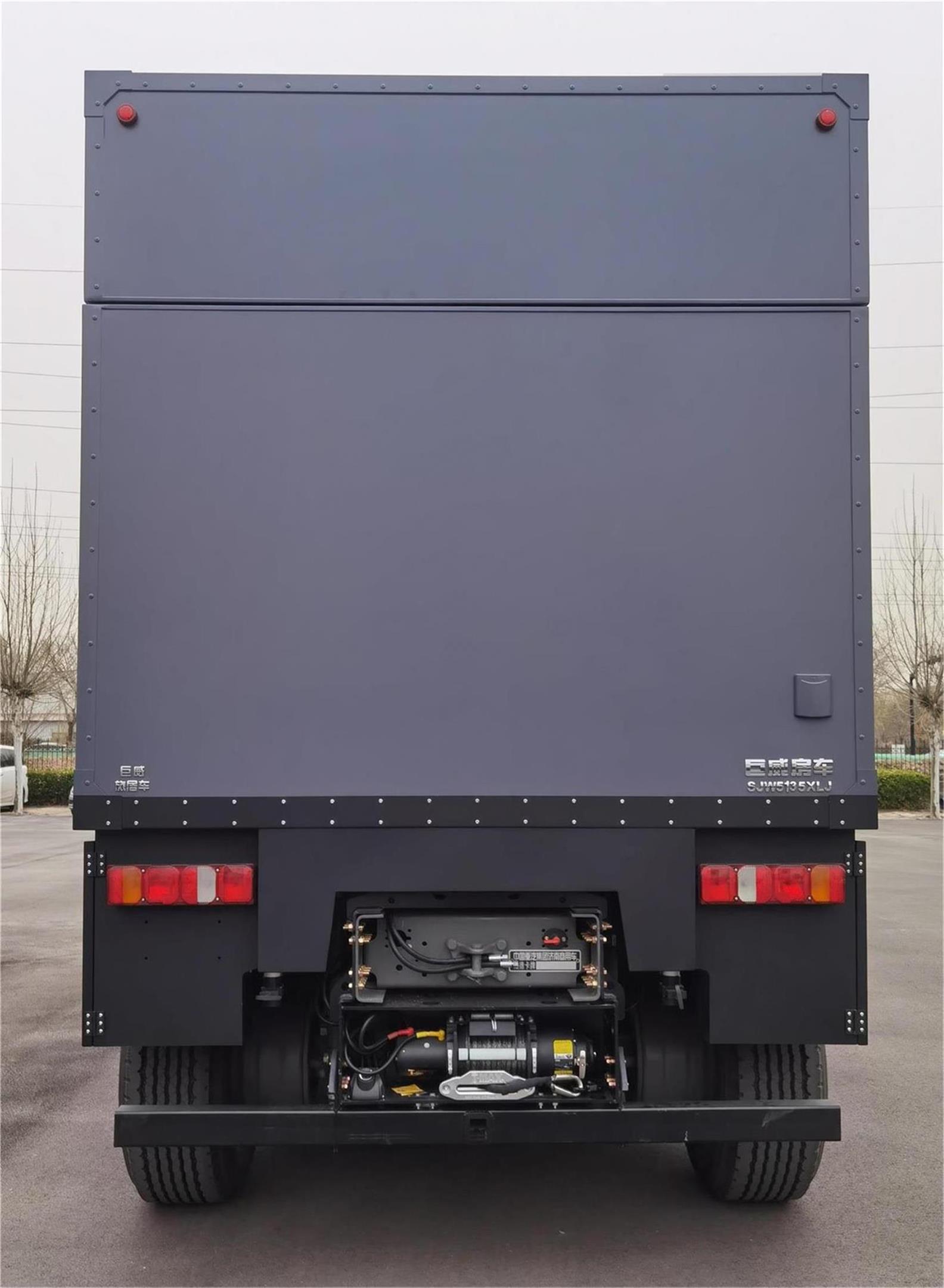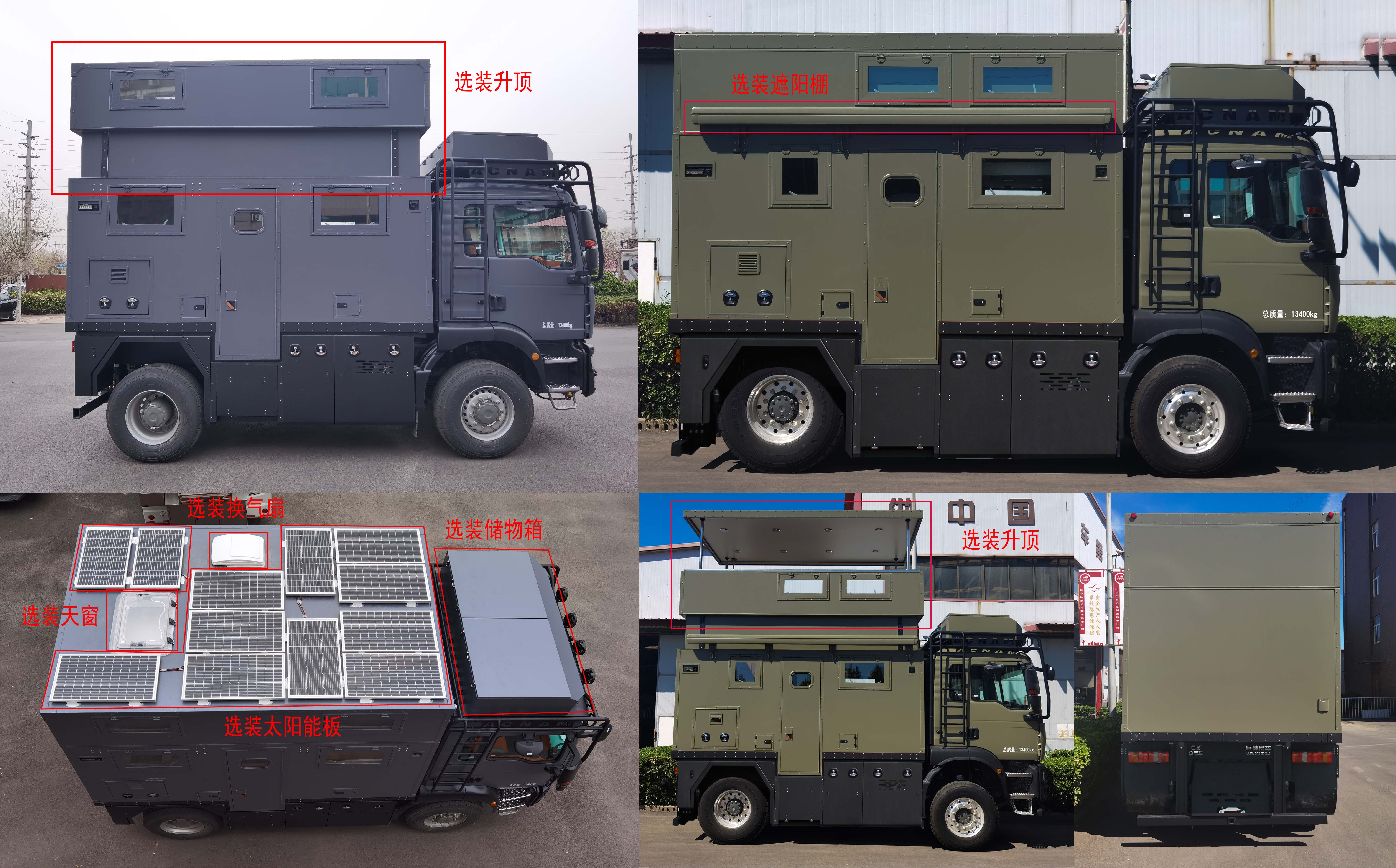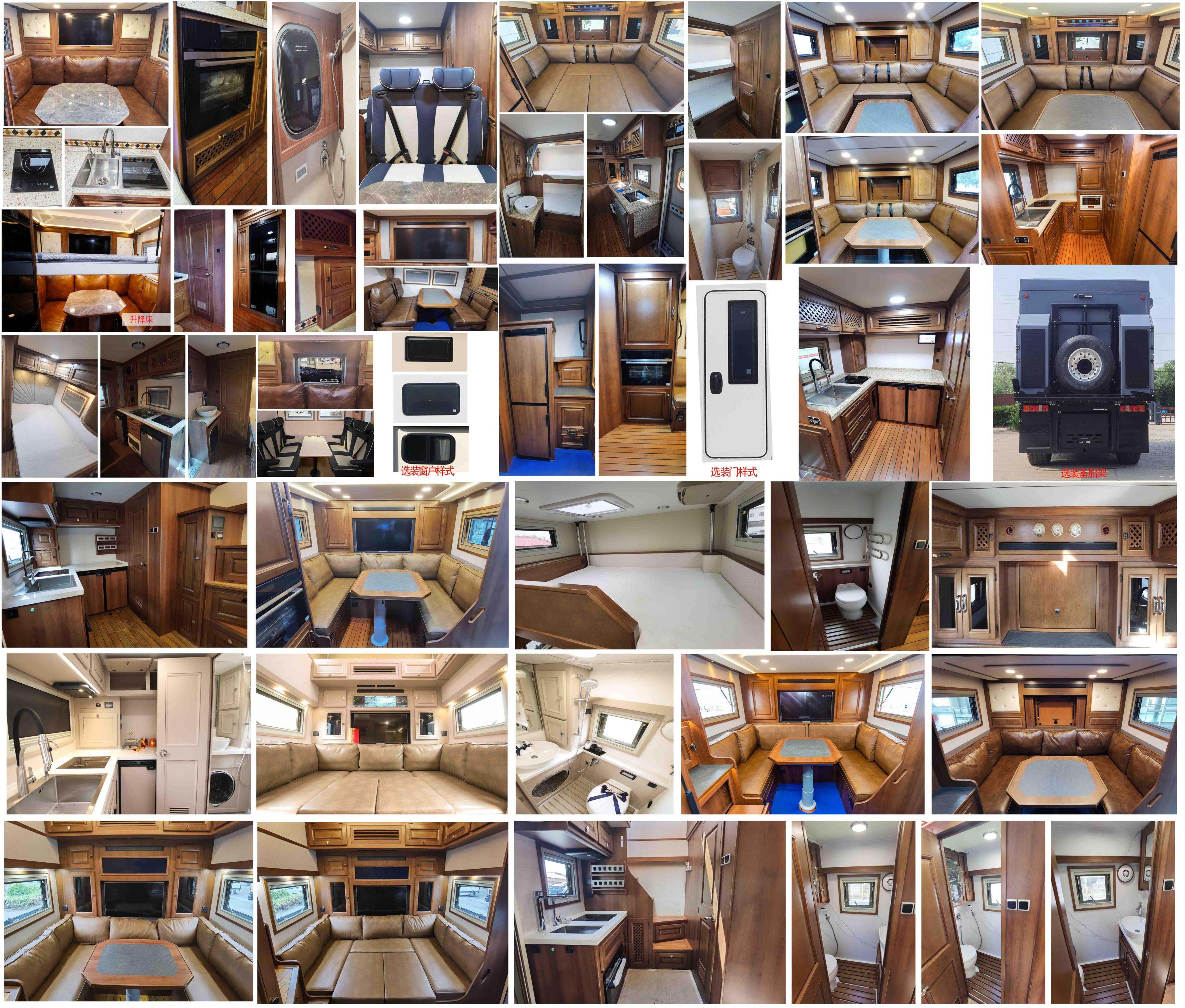 侧防护为裙边结构,材质为Q235,后防护材质为Q235,断面尺寸(宽×高)mm:80×120,离地高度:350mm,连接方式为螺栓连接。配备有桌椅,睡具,卫生设施等旅居生活设施。选装升顶、太阳能板、天窗、换气扇、储物箱、遮阳棚、备胎架;选装窗户及门的样式;安装EBS,EBS系统控制器生产企业为采埃孚商用车系统(青岛)有限公司,EBS系统控制器型号为EBS3;车顶及车身侧面灯具行驶过程中不允许使用,仅作为野外生活照明使用;该车型可选装ETC车载装置。仅选用轴距3600mm底盘。驻车时车辆后顶可开启升降。 |