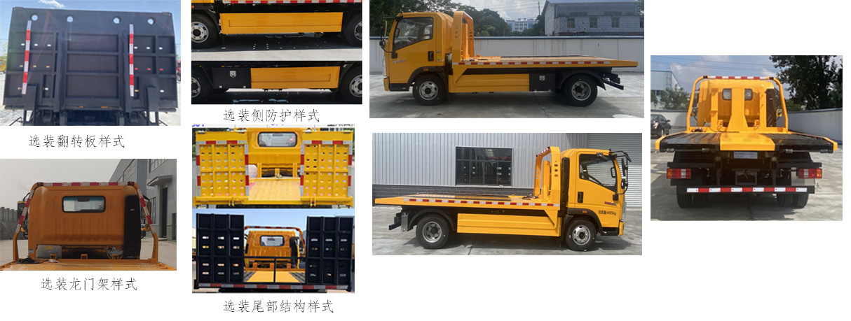 1.该车主要用于道路清障,主要专用装置为平板、绞盘、钢丝绳、油缸.该车无托举功能.2.侧、后防护材料均为Q235,连接方式均为焊接连接,后防护截面尺寸(mm):100×50,下缘离地高370mm,3.ABS系统控制器型号/生产企业对应关系为:CM3XL-4S/3M(4SF)/广州瑞立科密汽车电子股份有限公司;XH-KQ4S3M-E01/广州市西合汽车电子装备有限公司,整备质量包含随车工具、灭火器、停车楔、不含备胎.选装不同风格的油箱.整车长/前悬/轴距/后悬对应关系(mm):5995/1175/3280/1540,5995/1175/3360/1460,5995/1175/3650/1170.随底盘选装驾驶室,扩展龙门架样式,侧防护样式,后翻转板样式.尾部结构样式,选装外观样式. |