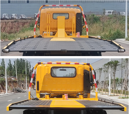 主要专用装置为平板、液压绞盘,用于道路清障。该车不具备拖牵功能;侧防护装置材料材质:Q235,连接方式:螺栓连接,后下部防护装置材料材质:Q235,连接方式:焊接连接,断面尺寸(宽×高):50×100(mm),离地高度为450mm。整备质量包含停车楔、随车工具,不包含备胎、灭火器;ABS型号及厂家对应关系:液刹:ABS系统型号:YF8;生产企业:武汉元丰汽车电控系统有限公司.气刹:ABS系统型号:ABS-VI.E;生产企业:广州瑞立科密汽车电子股份有限公司。选装后部结构。 |
