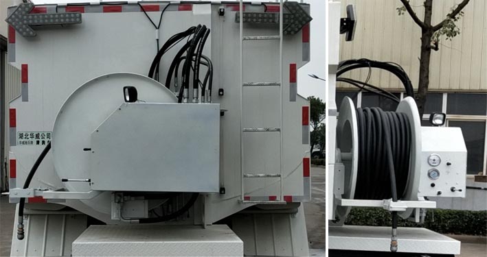 车身喷漆采用白蓝相配,寓意蓝天白云,保卫环境整洁的意思;整车外形尺寸为7930×2500×3060(mm),罐体容量大,车辆额定载质量达到9205,9270(Kg),保证了运输的水容量,改装配置上,加装有60米的耐高压钢丝清洗高压管,方便近距离作业;配上金属喷漆,提高车辆档次,确保罐体无掉漆,延长使用寿命,同时整车造型美观,比例协调。