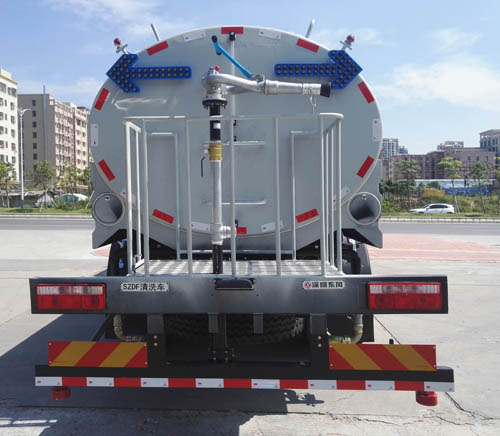 东风牌D9 10.8方路面清洗车,一款用于清洗城市下水道、管道沉积物死角泥垢的疏通作业车,该车整车尺寸8280×2480×3030(mm),选用轴距为4500,5200,3950(mm),东风牌EQ1181LJ9BDE底盘改装而来,上户吨位为10525(Kg),罐体为椭圆造型,喷漆多色可选,整车外观简洁大方。