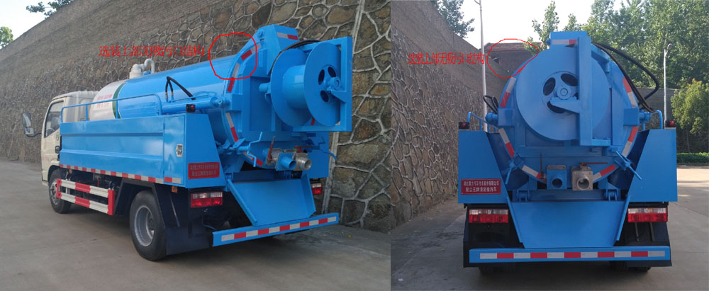 选装车辆外观,随底盘选装前面罩以及前雾灯;选装后部带吸污口结构;选装罐体顶部后端不带吸污口结构; 污水罐载质量2430kg,污水罐有效容积:3.18立方米, 罐体外形尺寸(直段长× 直径)(mm):3100×1200,运输介质: 液态污物,密度:800千克/立方米;清水罐载质量2430kg,清水罐有效容积: 2.43立方米,罐体外形尺寸(长×长轴×短轴)(mm): 3000×700×800,运输介质: 水,密度:1000千克/立方米;水罐和吸污罐为两个独立罐体,清洗功能时用水罐, 吸污功能时用吸污罐,清洗吸污两种功能不同时使用,两个罐体不能同时满载;侧防护材质Q235,螺栓连接;后防护材质Q235,焊接连接,后防护截面高度尺寸120mm,截面宽度尺寸50mm,下边缘离地高度400mm;ABS厂家及型号:襄阳东风隆诚机械有限责任公司/ABS/ASR-24V-4S/4M;该车专用装置主要由罐体和泵组成,用于下水道排污及疏通.采用3308mm轴距底盘. |