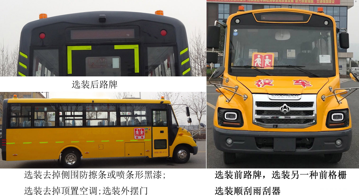 1,可取消顶置空调,取消顶置空调并选装带换气扇顶风窗时,对应整车高度为2980mm,取消顶置空调并选装不带换气扇顶风窗时,对应整车高度为2930mm,安装顶置空调时对应的整车高度为3080mm;2,选装顶置空调时高配车型整备质量为5755kg、低配车型整备质量5655kg;选装去掉顶置空调时高配车型整备质量为5625kg、低配车型整备质量为5525kg;3,可选装外摆门;4.可选装前后路牌;5,选装侧围防擦条或喷条形黑漆;6,该车安装具有卫星定位功能的行驶记录仪;7,安装广州瑞立科密汽车电子股份有限公司的CM4XL-4S/4M型ABS;8,发动机净功率为99KW;9,油耗申报值:16.7L/100km;10,可选装360环视系统;11,可选装司机疲劳驾驶报警系统;12,可选装车道偏离预警系统;13,可选装学生安全带报警;14,可选装胎压监测;15,可选装司机窗内置推拉窗;16,可选装顺刮雨刷器;17,车身右侧可取消侧箱,选装不同款式侧风窗玻璃;18,可选装司机窗上粘接下推拉. |