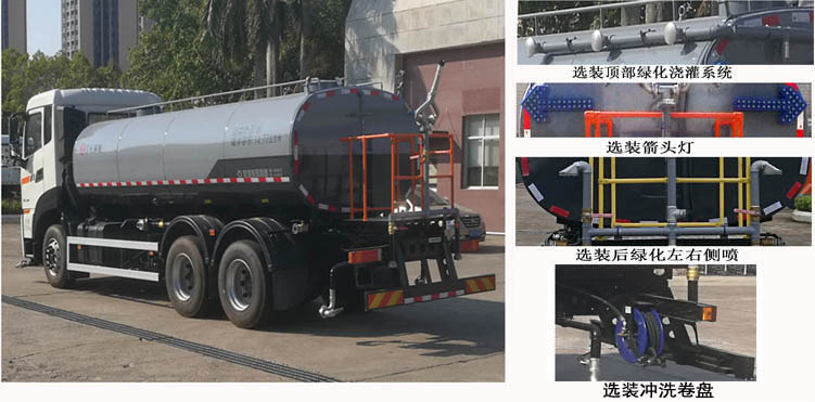 该车配有水罐总成,清洗装置,水路和控制系统等,用于清洗作业。随底盘选装驾驶室,选装不同样式的后处理装置。顶部侧绿化浇灌系统、箭头指示灯、尾部左右侧喷、冲洗卷盘为选装件。罐体有效容积14.77立方米,罐体外形尺寸(mm)(长轴X短轴X罐长):2400X1430X5820。介质名称:水,密度:1000千克/立方米。侧防护装置材质为铝合金,采用螺栓连接;后防护装置材质为Q345B,采用螺栓连接,截面尺寸(mm)为180×65,最大离地高度430mm。该车安装具有卫星定位功能的行驶记录仪。随底盘安装ABS,ABS型号/生产厂家:3631010-C2000/东科克诺尔商用车制动系统(十堰)有限公司,ABS 8/东科克诺尔商用车制动系统(十堰)有限公司,4460046450/威伯科汽车控制系统(中国)有限公司。 |