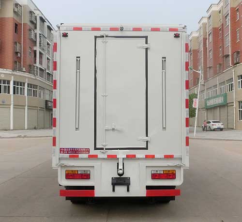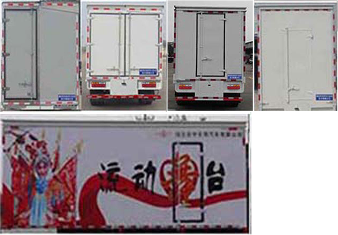 随底盘选装驾驶室,导流罩为选装件,选装后部门结构样式,选装厢体侧面开门样式。车厢顶棚封闭,并采用衍架结构,可升降,车厢两侧板可展开,与顶棚形成整车舞台顶棚;活动舞台板可折叠于车厢内,通过展开装置展后与固定舞台台面形成整车舞台台面;底盘大梁部分设有支撑装置。ABS生产厂家:威伯科汽车控制系统(中国)有限公司,型号:ABS-E4S/4M;浙江万安科技股份有限公司,型号:VIE ABS-II;广州瑞立科密汽车电子股份有限公司,型号:CM4XL-4S/4M。侧防护采用冷弯型钢/Q235-B,焊接连接,后防护采用冷弯型钢/Q235-B,焊接连接,后防护截面高度尺寸120mm,截面宽度尺寸50mm,下边缘离地高度420mm。该车作为流动演出的、可展开成为舞台。车长/轴距/前悬/后悬对应关系为:(毫米)5998/3300/1150/1548,5998/3300/1200/1498,5998/3300/1230/1468,6590/3300/1150/2140,6590/3300/1200/2090,6590/3300/1230/2060,7000/3550/1150/2300,7000/3550/1200/2250,7000/3550/1230/2220. |